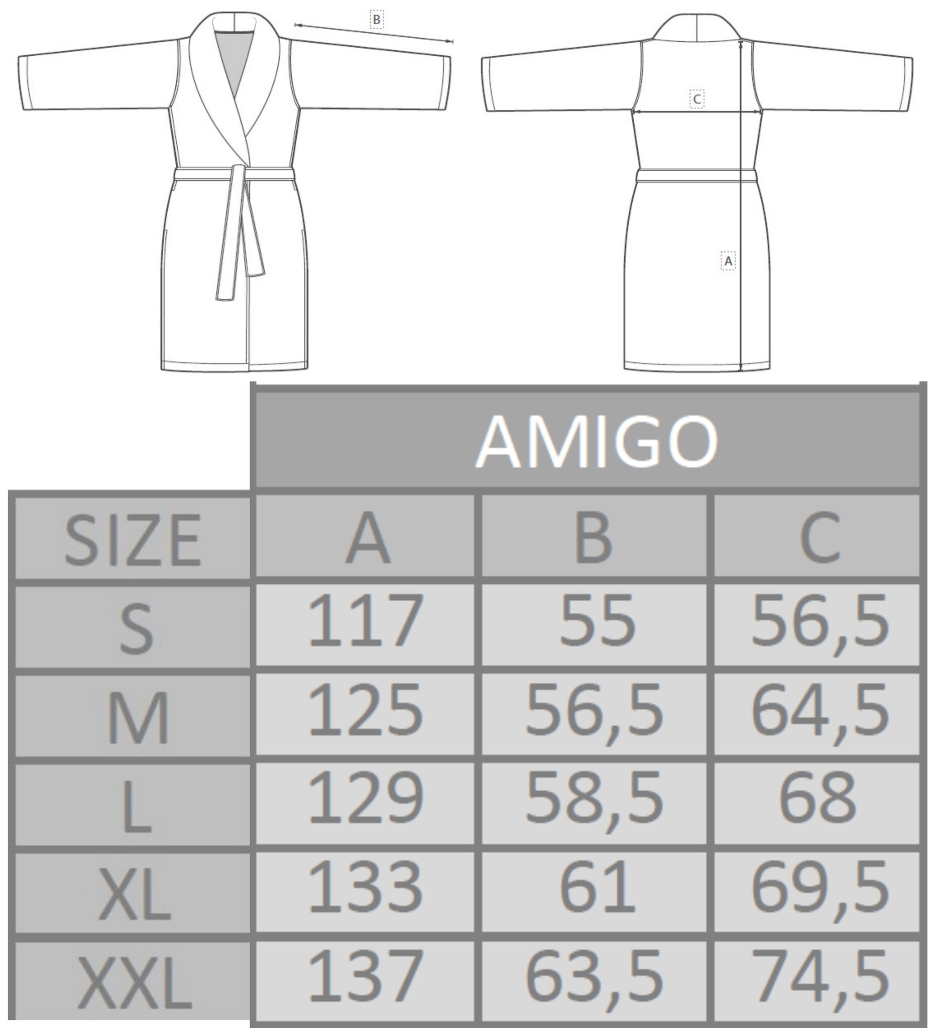 Deze Amigo badjassen zijn in 10 kleuren te bestellen; Andere kleuren uit de 60 kleuren van de badlijnen van Abyss zijn ook mogelijk, hiervoor geldt een toeslag van 15%. Deze badjassen zijn in de volgende maten verkrijgbaar: S, M, L, XL en XXL. Kijk voor de afmetingen van de badjassen op de laatste foto. Eventuele afwijkende maten zijn ook mogelijk; hiervoor geldt een toeslag van 30%.