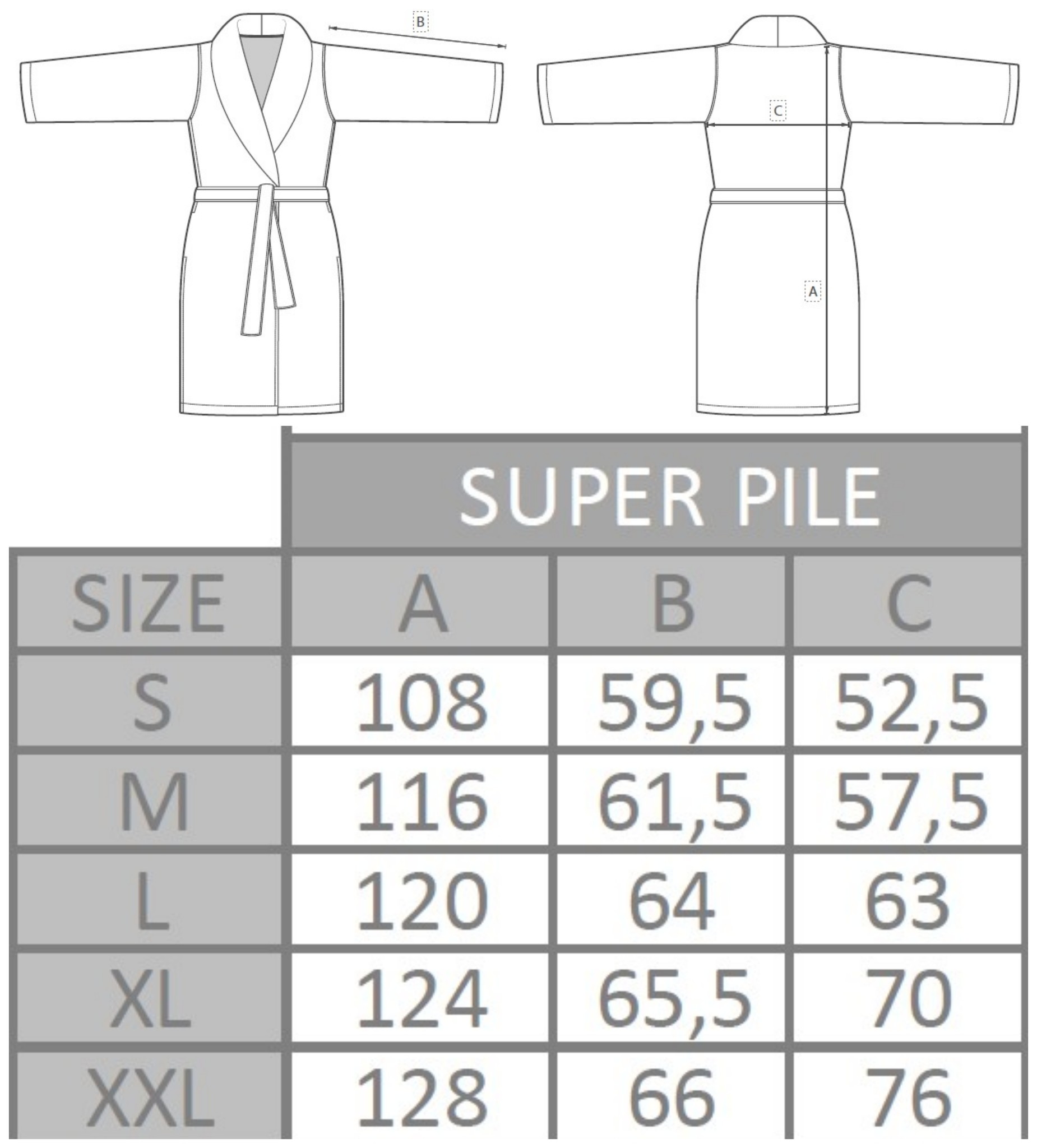 De Super Pile badjassen zijn in 10 kleuren te bestellen. Andere kleuren uit de Super Pile badlijn zijn ook mogelijk, hiervoor geldt een toeslag van 30%. Deze badjassen zijn in de volgende maten verkrijgbaar: S, M, L, XL en XXL. Kijk voor de afmetingen van de badjassen op de laatste foto.