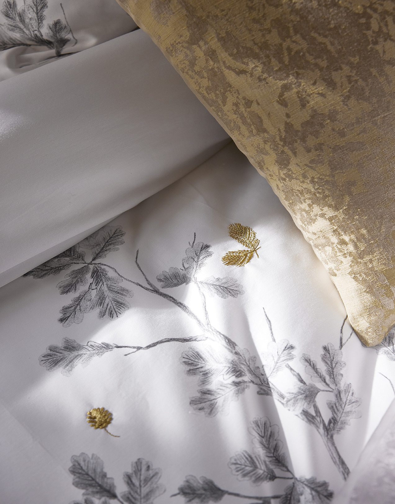Stylingtip Leg de Lin & Soie plaid over het voeteneinde van uw bed, gecombineerd met de bijpassende kussenhoes, voor een serene en rijke hoteluitstraling. In de woonkamer komt zij prachtig tot haar recht over een linnen of fluwelen bank; combineer met accessoires in zand, ivoor of warm amber om het goudaccent te versterken.