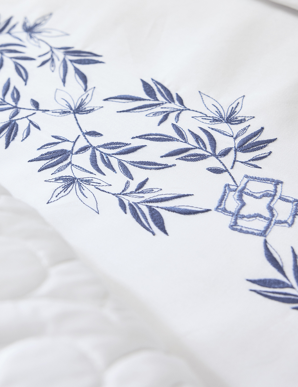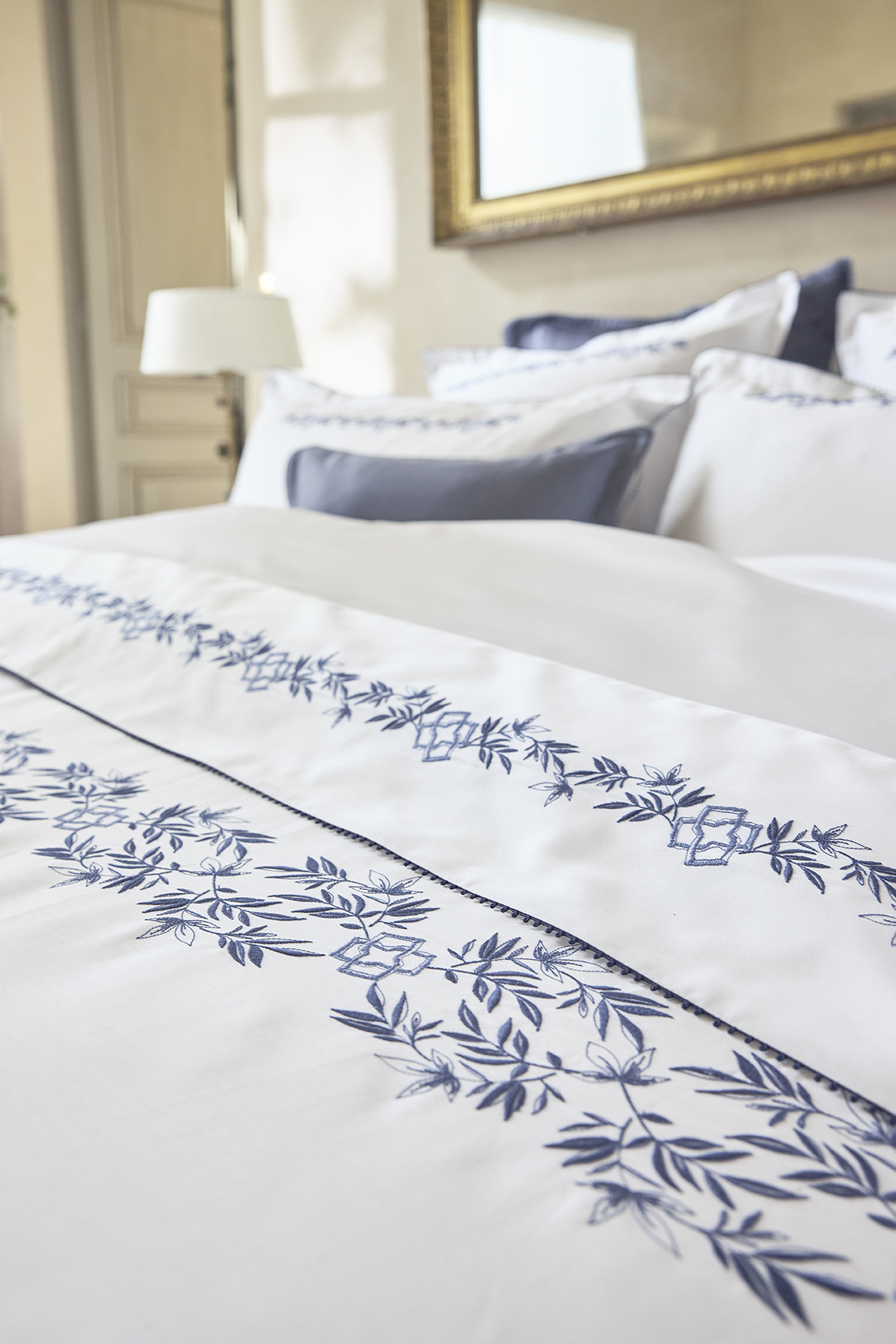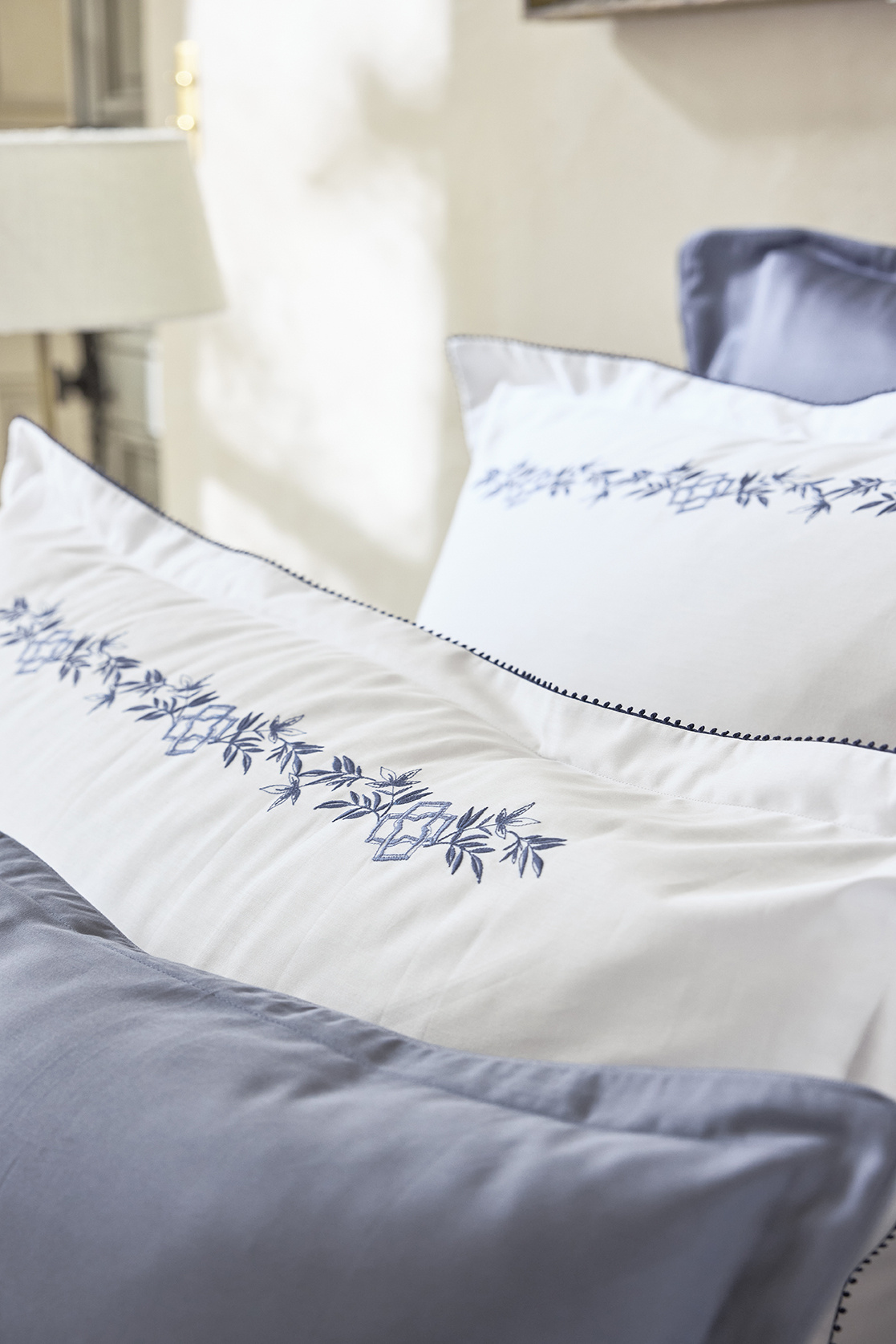 Het Mirabeau bleu dekbedovertrek van Alexander Turpault straalt discrete luxe en Franse verfijning uit dankzij het delicate plantenborduurwerk dat over de gehele breedte van het dekbedovertrek is uitgevoerd. Gemaakt van zuiverwit biologisch katoen satijn (300TC), wordt de zachtheid van het materiaal perfect gecombineerd met de subtiele glans en het vakmanschap van het borduurwerk.