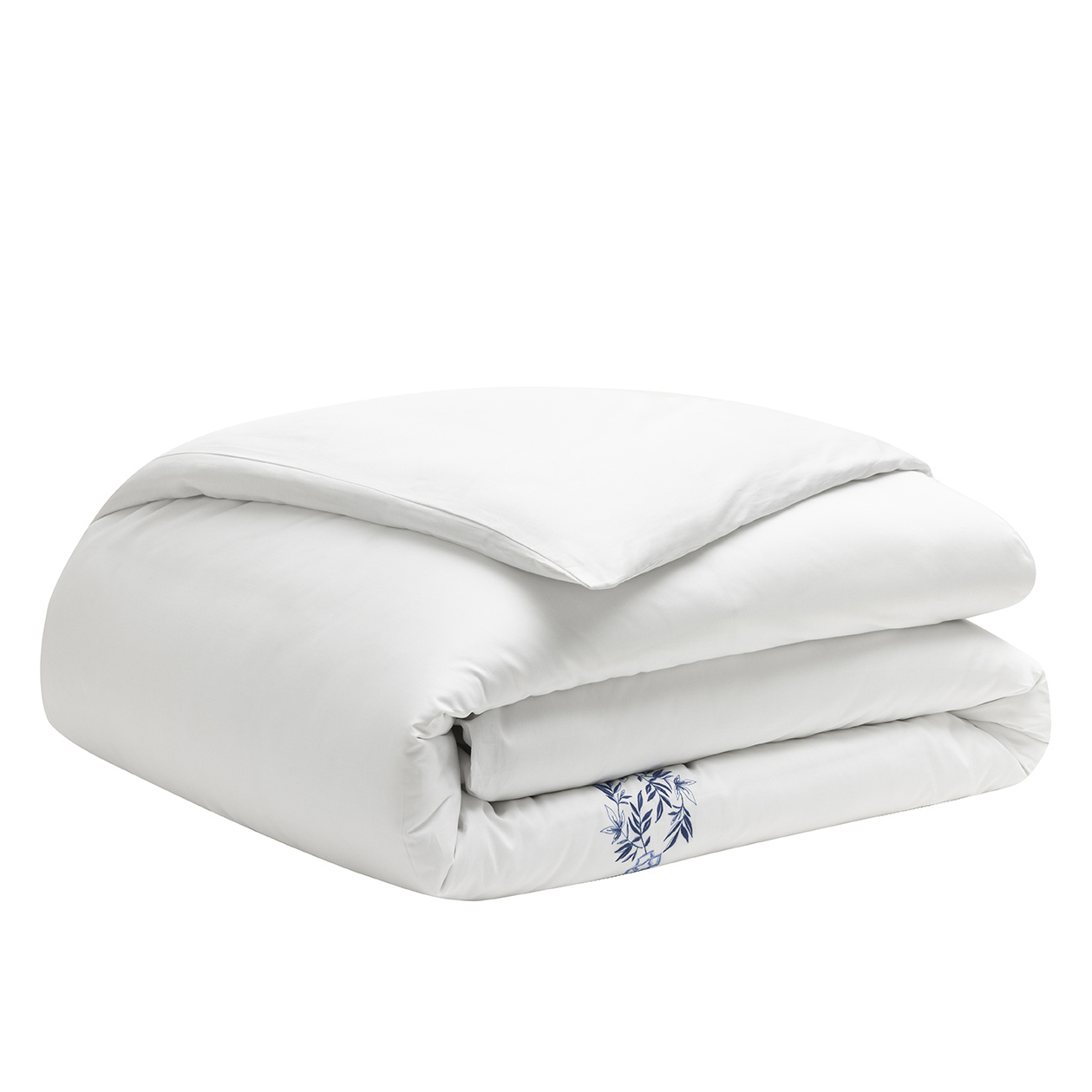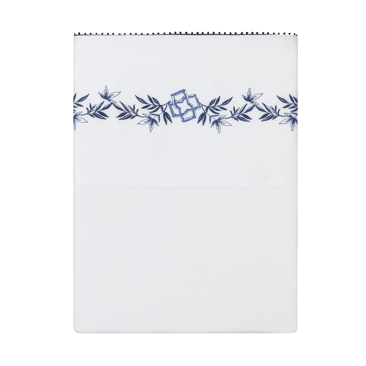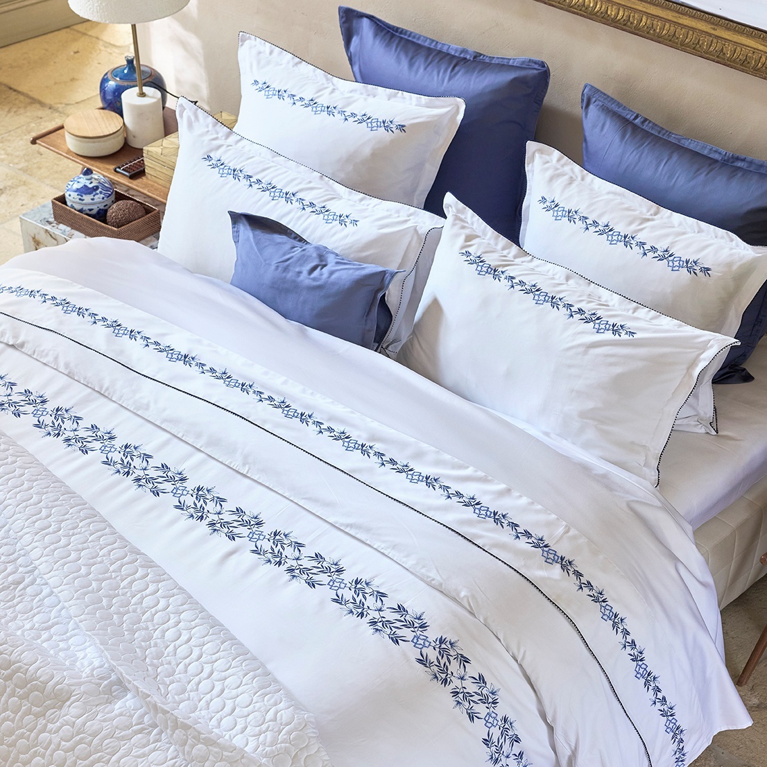 Het Mirabeau bleu dekbedovertrek van Alexander Turpault straalt discrete luxe en Franse verfijning uit dankzij het delicate plantenborduurwerk dat over de gehele breedte van het dekbedovertrek is uitgevoerd. Gemaakt van zuiverwit biologisch katoen satijn (300TC), wordt de zachtheid van het materiaal perfect gecombineerd met de subtiele glans en het vakmanschap van het borduurwerk.