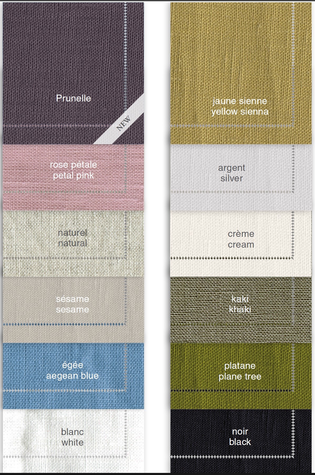 Op de eerste foto ligt de kleur prunelle op tafel, op de tweede foto de jaune sienne, op de derde foto is de kleur sesame te zien. Op de 4e foto ziet u het tafellaken in de kleur khaki. Foto 5 ziet u een placemat in de kleur naturel. Op de 6e foto ziet u het tafellinnen in de kleur argent, en de servet voor op het krukje is in de kleur blanc. Op foto 7 ziet u de kleur plane tree en op foto 8 de kleur rose pétale.
