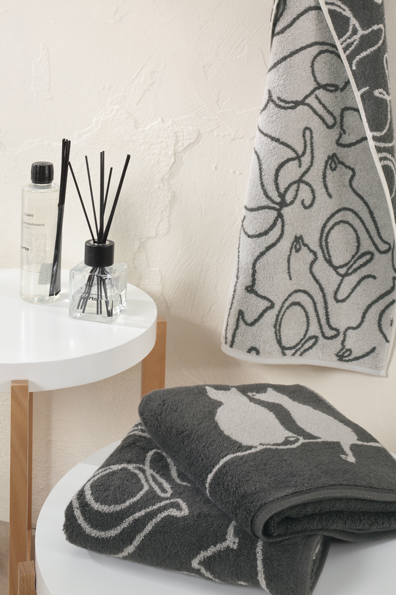 Combineer de Cute Cats handdoeken met effen badtextiel in zachte tinten zoals wit, lichtgrijs of donker grijs voor een speels accent, of ga juist voor meerdere Cute Cats maten samen voor een compleet, gezellig setje in de badkamer.