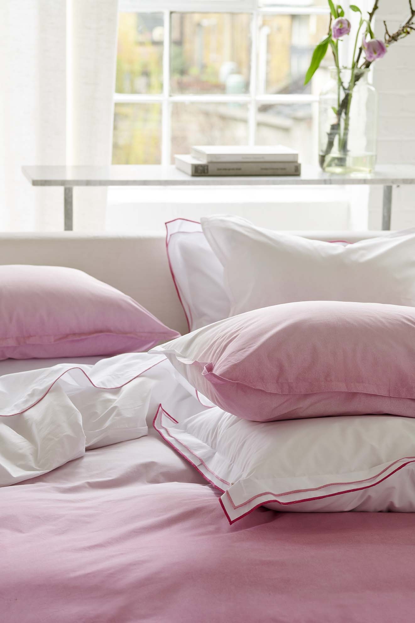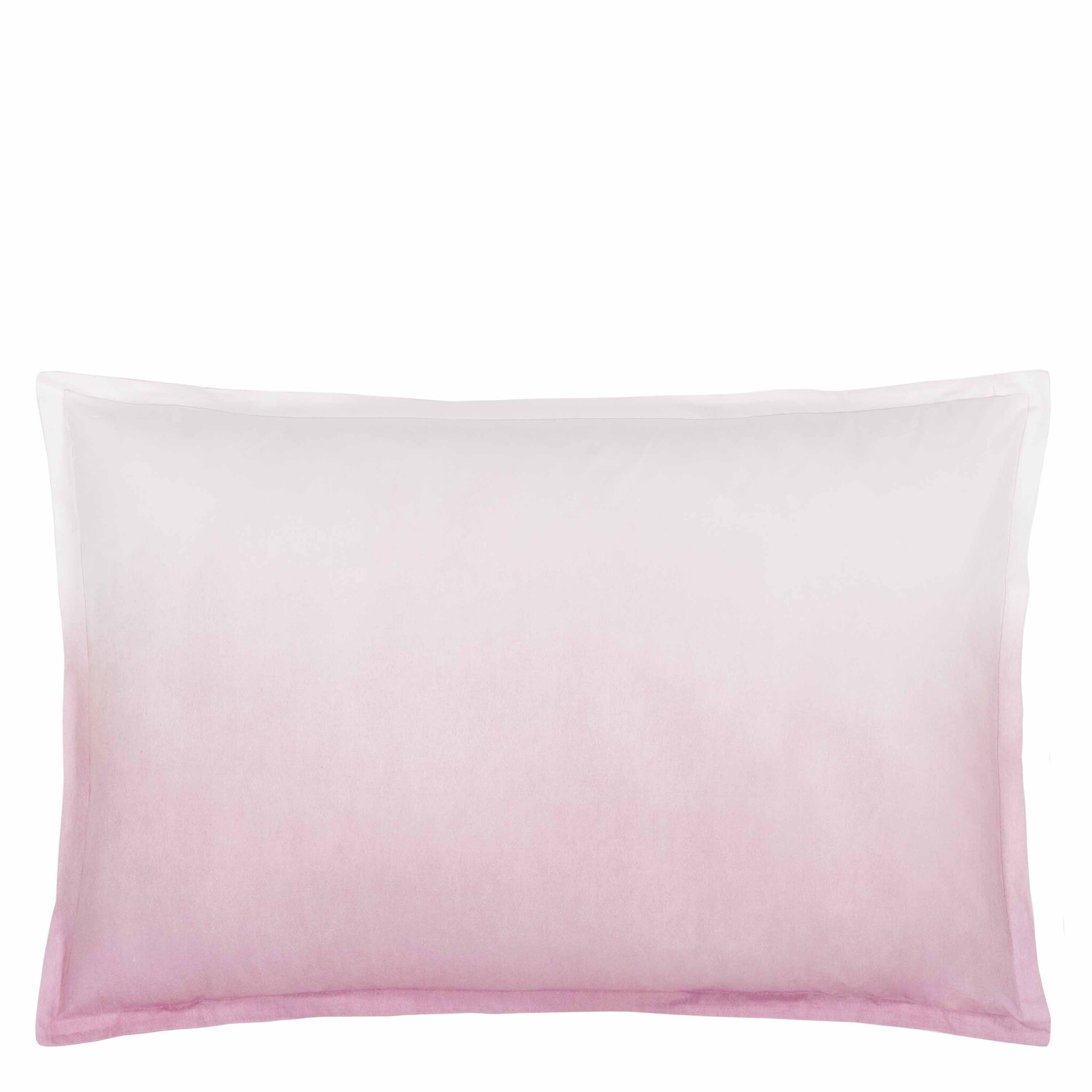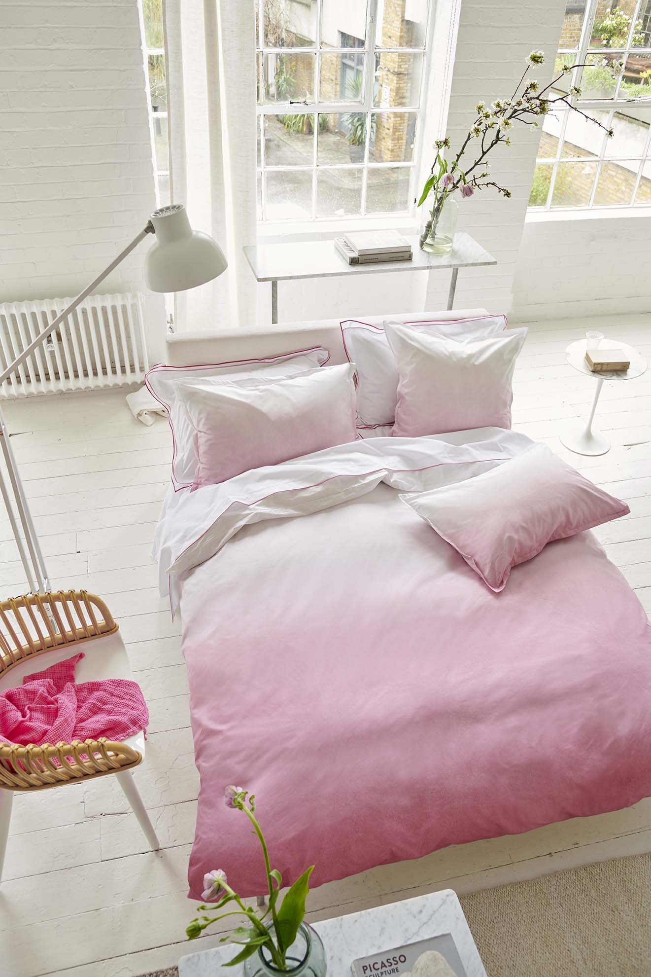 De Shoshi Fuchsia beddengoed lijn van Designers Guild is een mooi ombre-patroon, met levendige tinten fuchsiaroze die subtiel vervagen naar wit, wat de elegantie van een handgeschilderd schilderij oproept. De kussenslopen, afgewerkt met een platte ruche, voegen een extra vleugje verfijning toe aan deze moderne set. Alles in finesse, het decoreert de slaapkamer met grote delicatesse