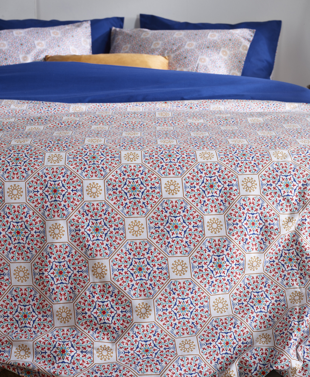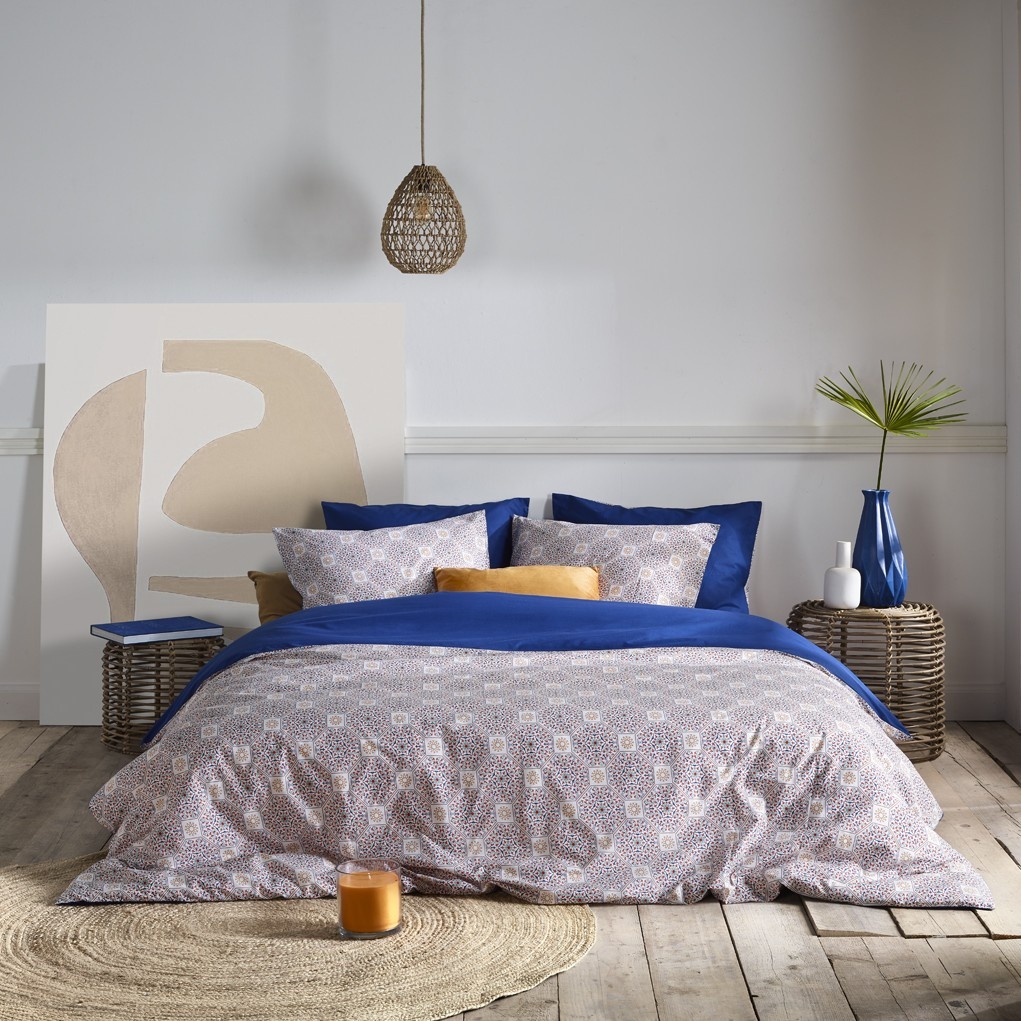 Een groot voordeel van deze set is de dubbelzijdige uitvoering. De voorzijde heeft het kleurrijke Aziz dessin, terwijl de achterzijde is uitgevoerd in een mooie effen blauwtint. Zo kunt u eenvoudig wisselen tussen een uitgesproken look en een rustige basis, afhankelijk van uw stemming of interieur.