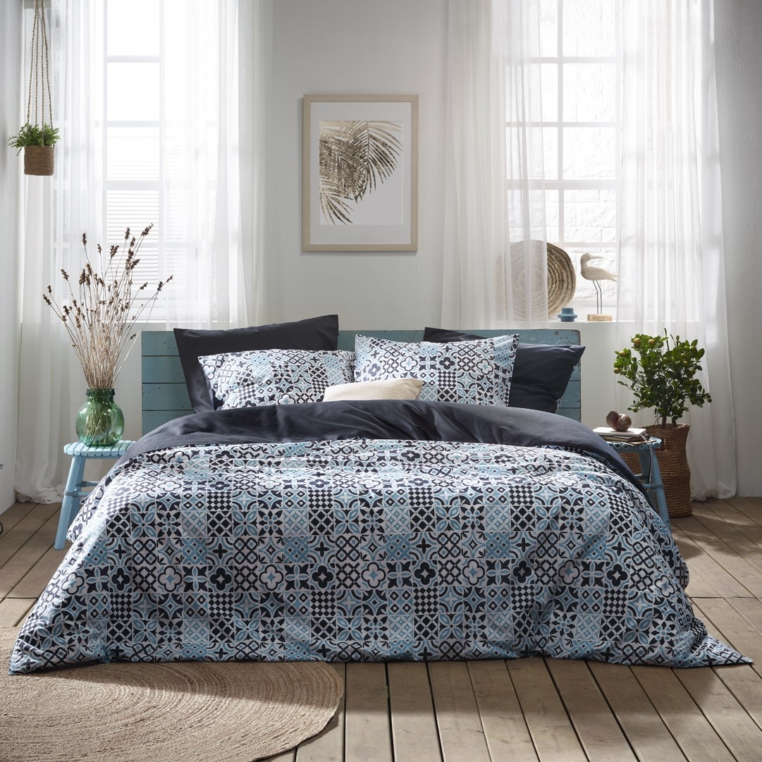 Combineer Azula oxyde met een effen hoeslaken in grijs, blauw of wit voor een rustig en harmonieus geheel. Voeg kussens of een plaid toe in natuurlijke tinten om de kleuren van het dessin mooi te laten uitkomen.