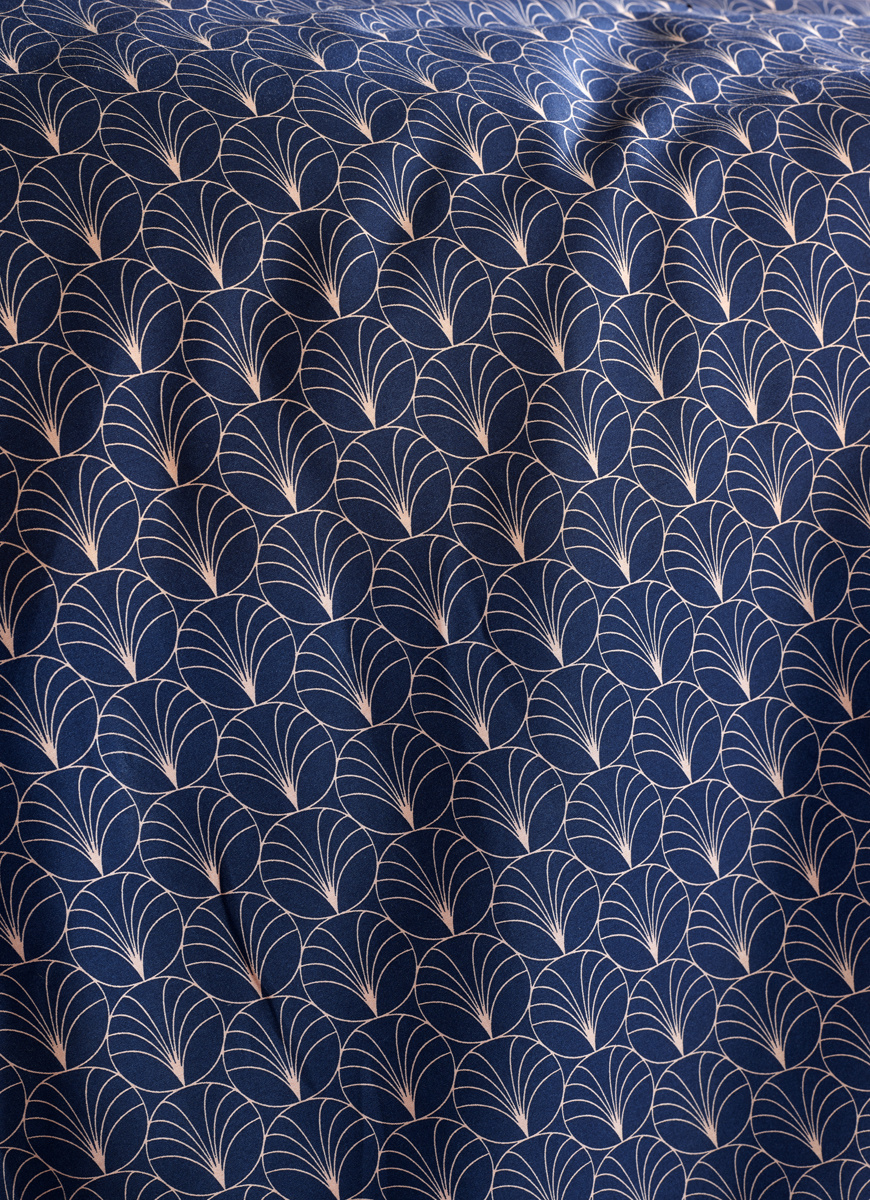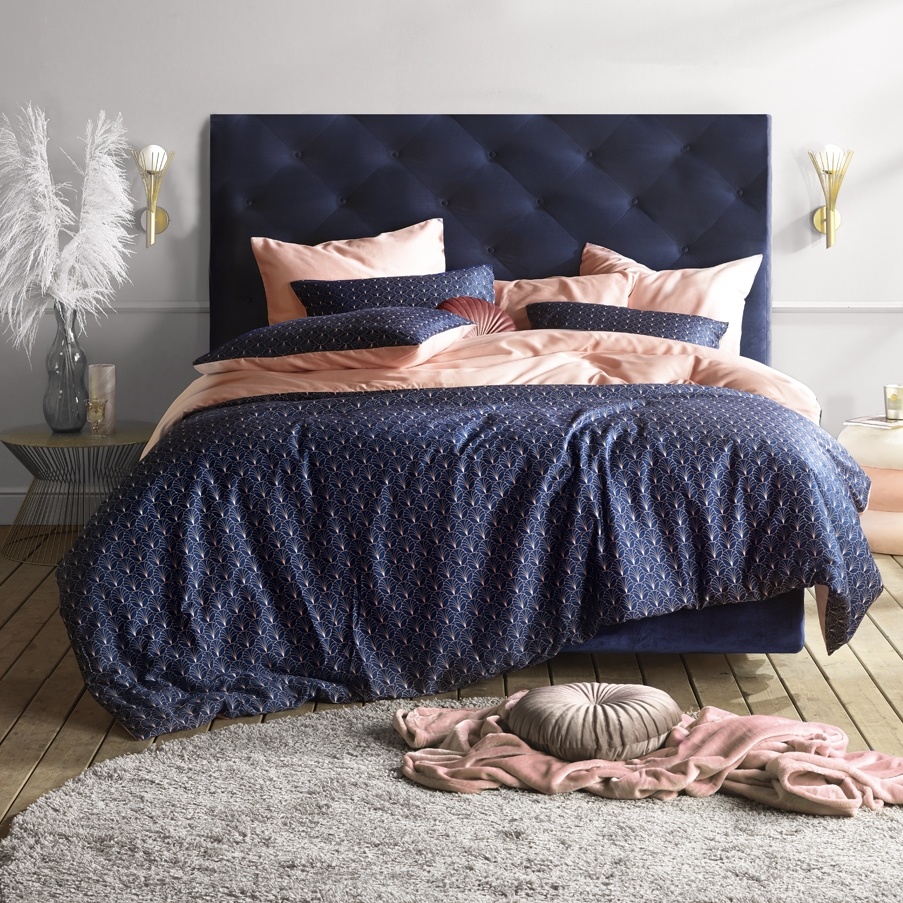 De combinatie van de mooie donkere blauwe ondergrond en het zachte zalmrose pastel, maakt het Idyllic sphinx dekbedovertrek van De Witte Lietaer een geliefd ontwerp!
