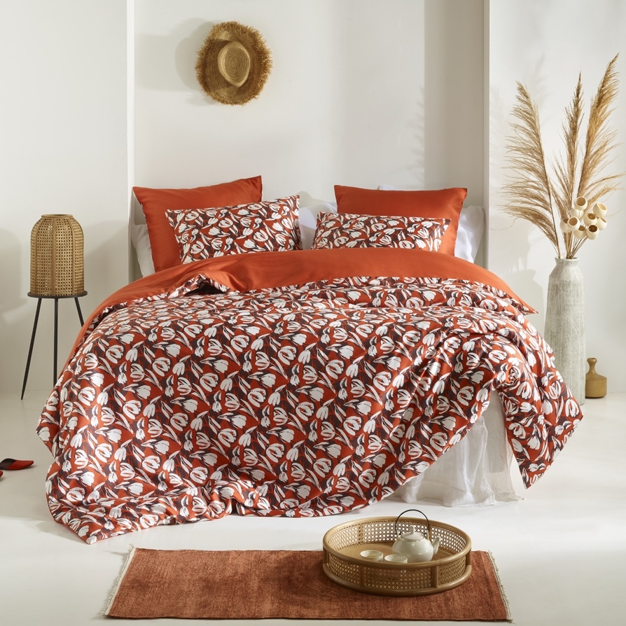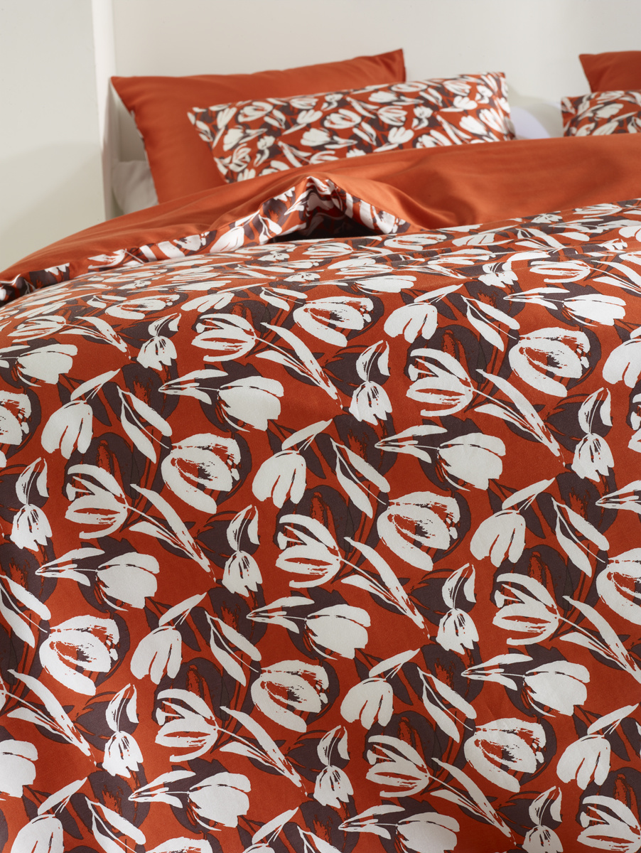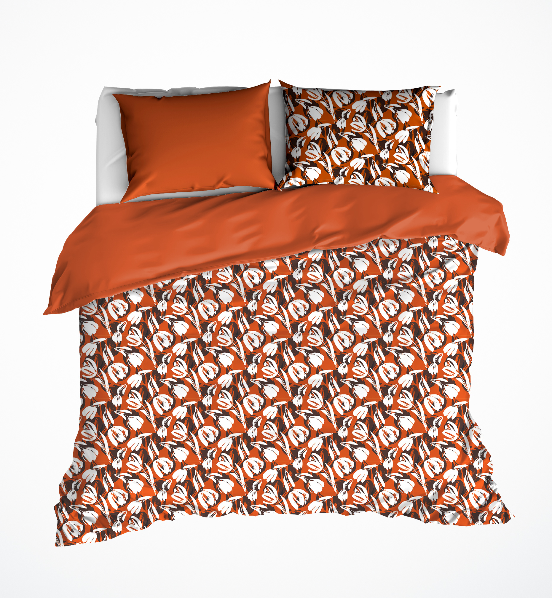 Het dekbedovertrek en de kussenslopen, zijn gedrukt op 100% katoen satijn 200TC, dubbelzijdig en dus omkeerbaar; de ene zijde in de tulpenprint, de andere zijde een uni warme oranjetint. Het dekbedovertrek is afgewerkt met een flessenhals. De kussenslopen hebben de maat 60x70 cm.
