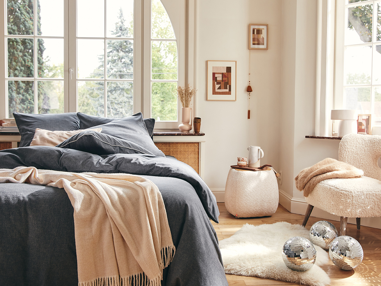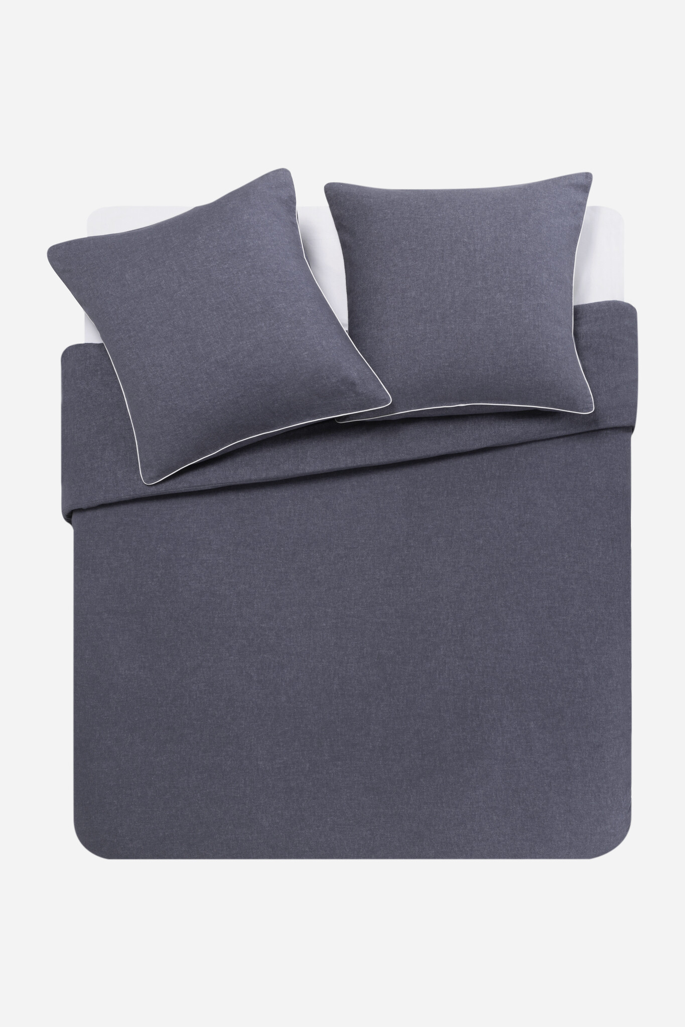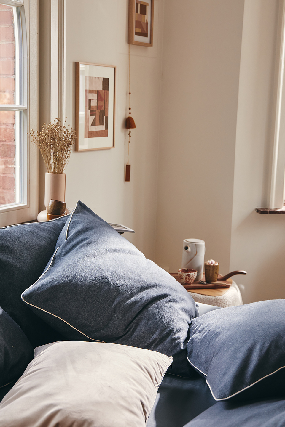De bijpassende kussenslopen zijn afgewerkt met een contrasterend paspel van ecru katoen.