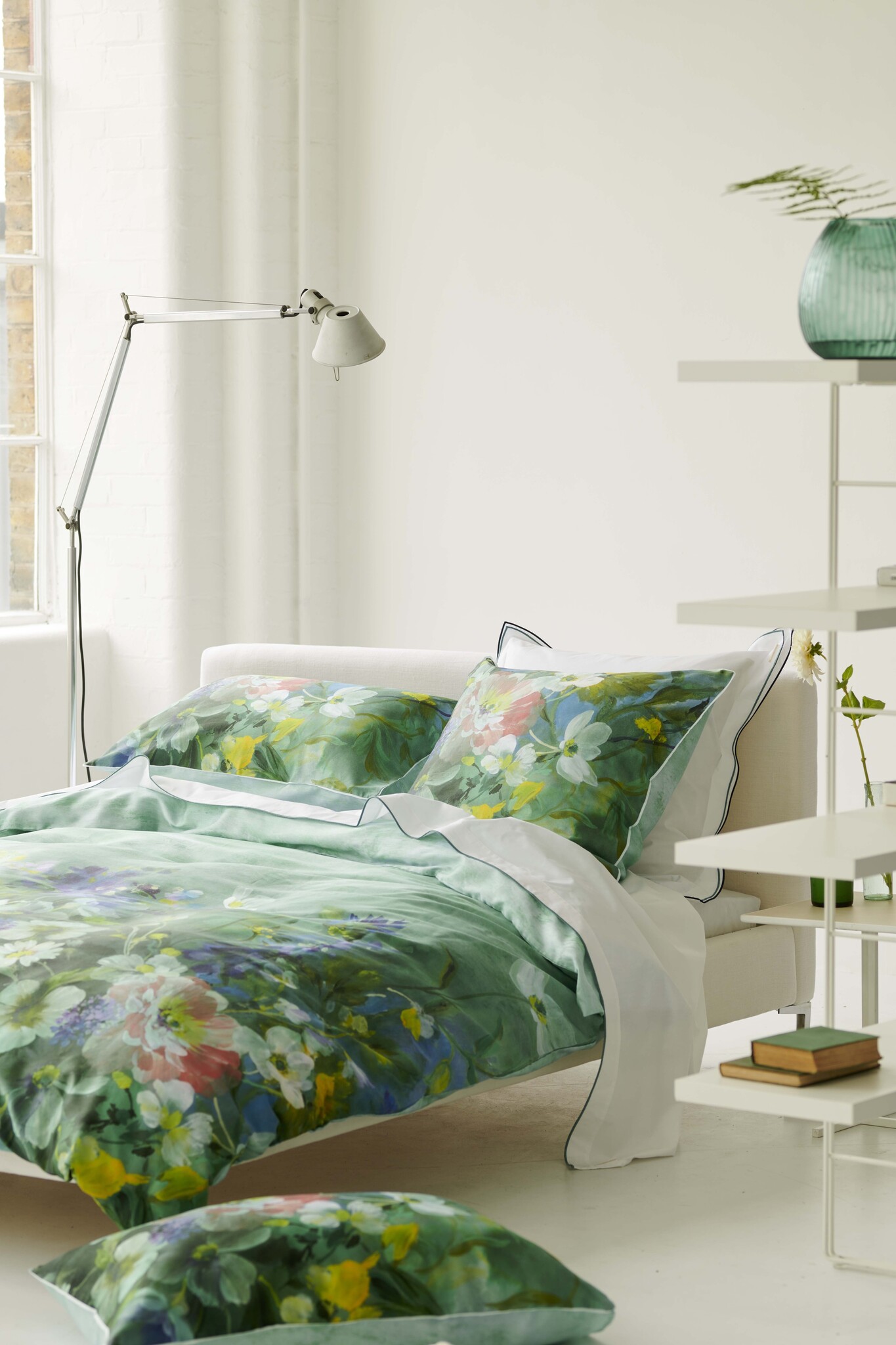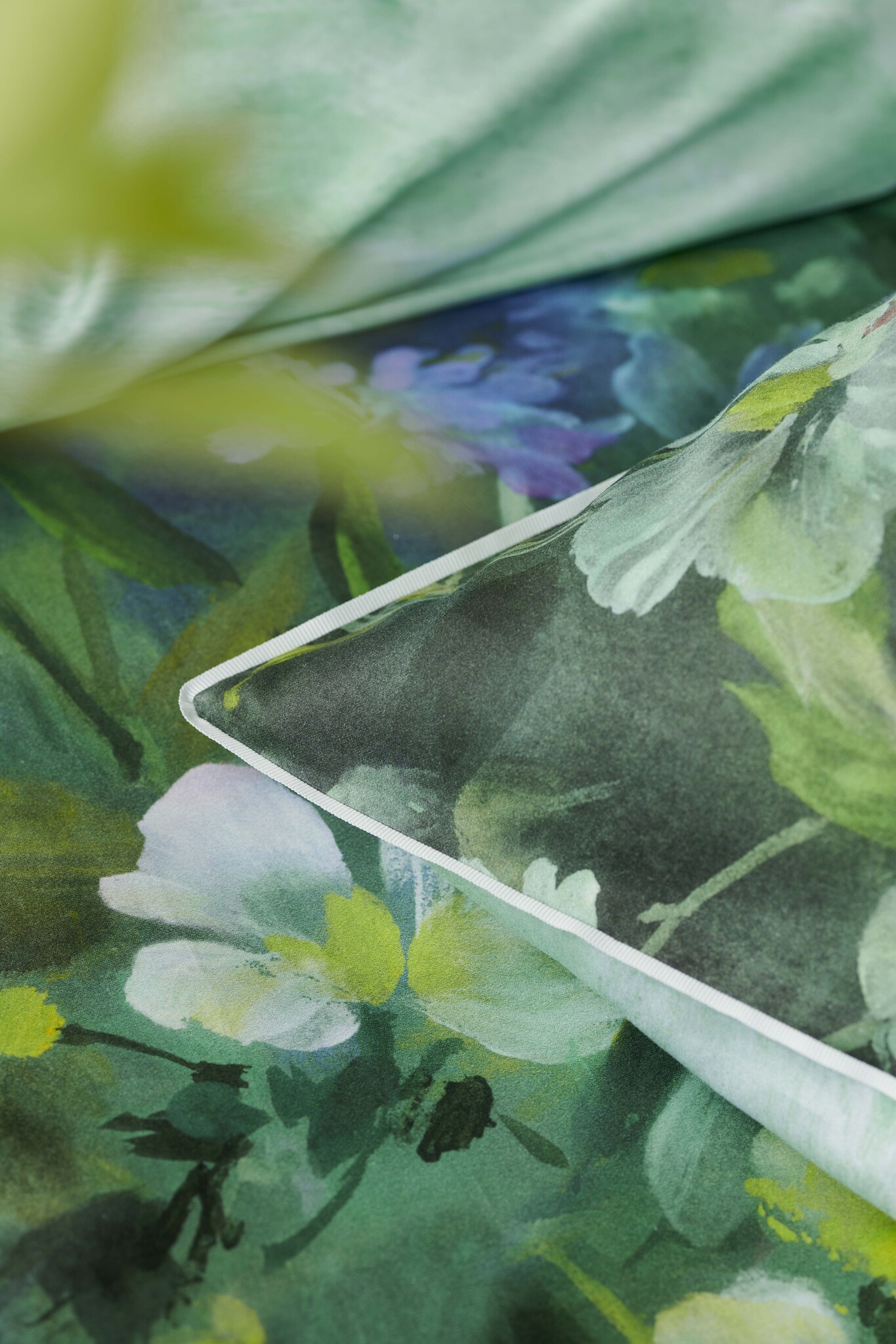 Dit artistieke ontwerp is digitaal gedrukt op weelderig katoensatijn 200TC en wordt geaccentueerd met een elegant wit biesje op de kussensloop.
