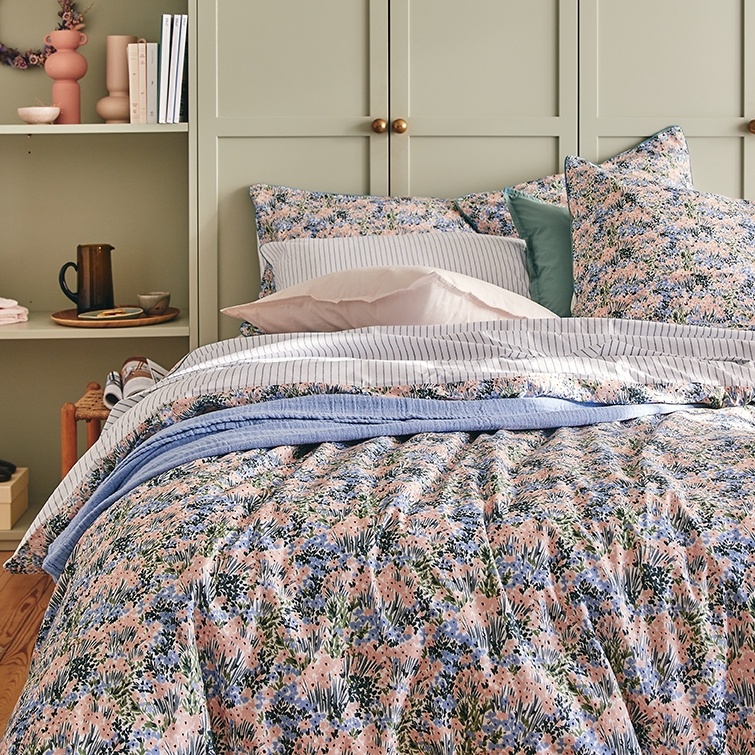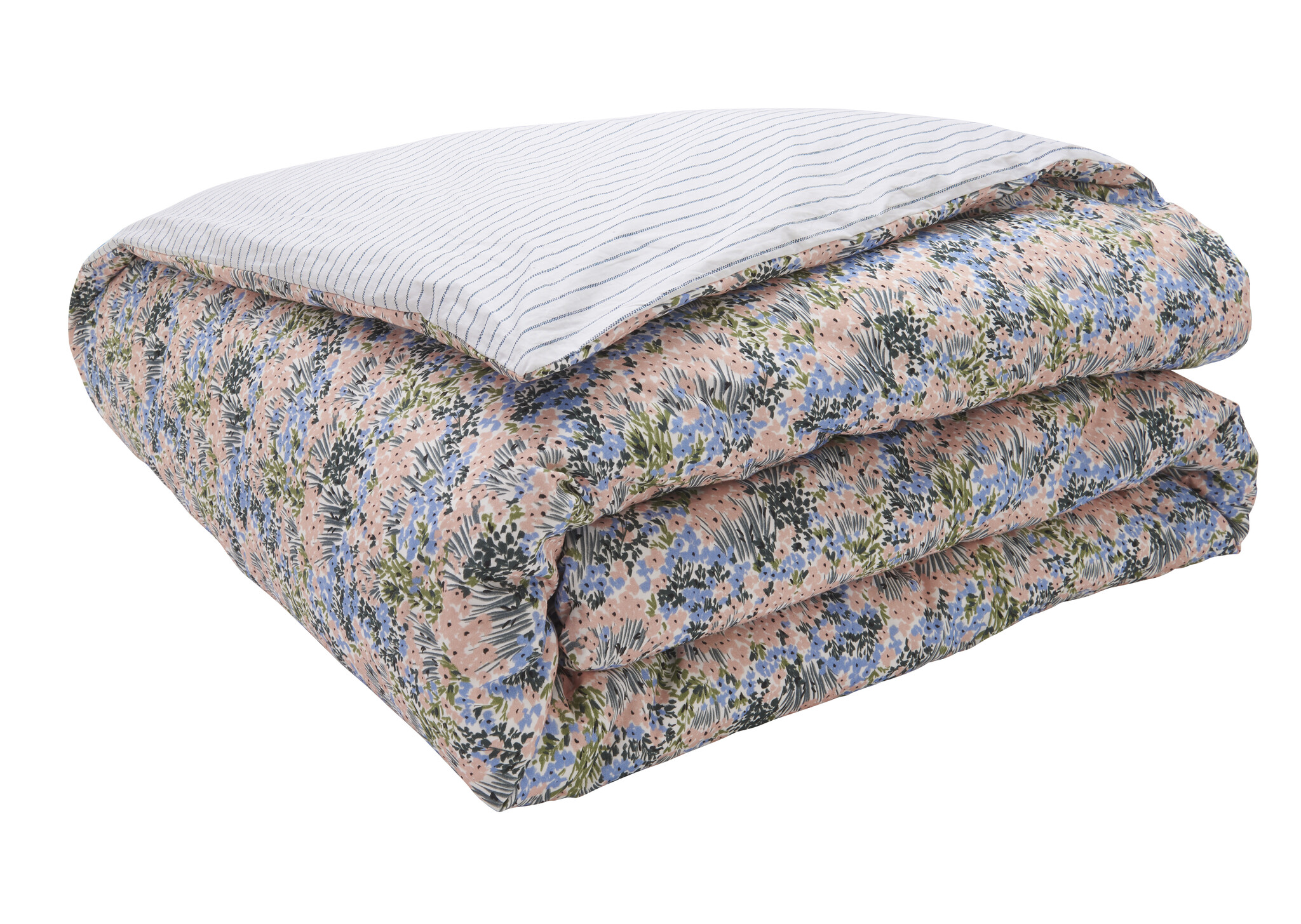 Bosquet van Essix is een fris en zacht ontwerp die een immens bloemenveld weergeeft. Het geheel is een evenwichtige combinatie van roze, blauwe en groene kleuren. Zowel de achterzijde van het dekbedovertrek als de kussenslopen is voorzien van agave kleurige lijnen. De kussenslopen van de Bosquet worden afgewerkt met een agave kleurige paspel.