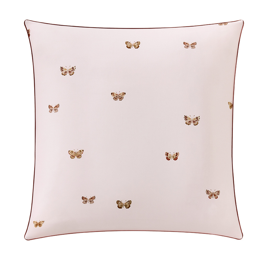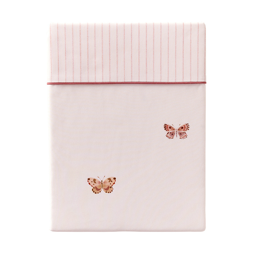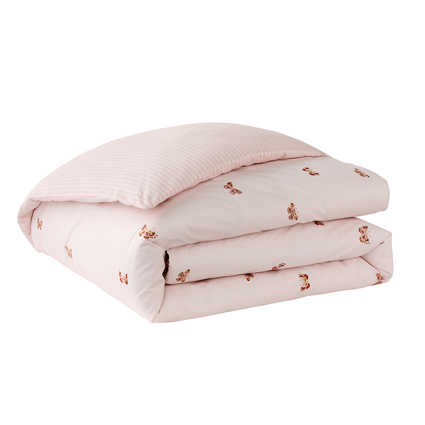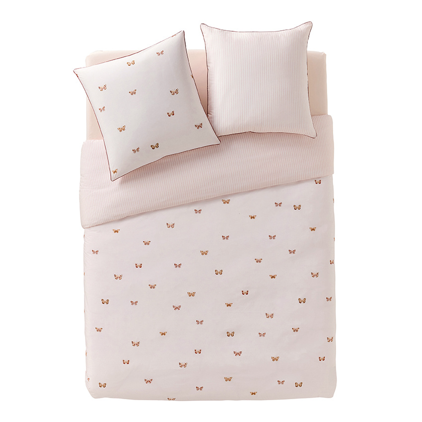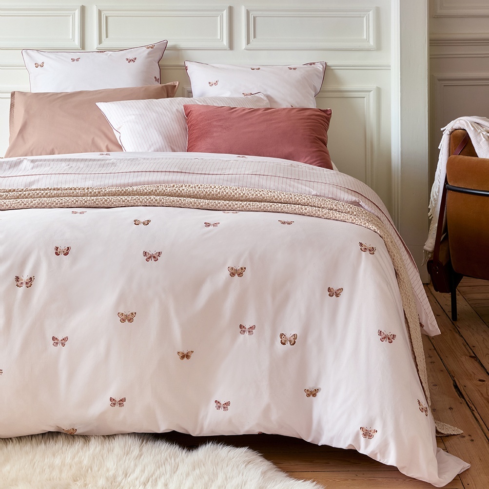 Deze mooie, zachte en rustgevende set Délicatesse van Essix is een ode aan de schoonheid van vrouwelijkheid. Het motief is met gouache geschilderd en versierd met zachte kleuren die met het oudroze contrasteren, om de lichte streep van de omslag en de paspelband van de kussenslopen te benadrukken.