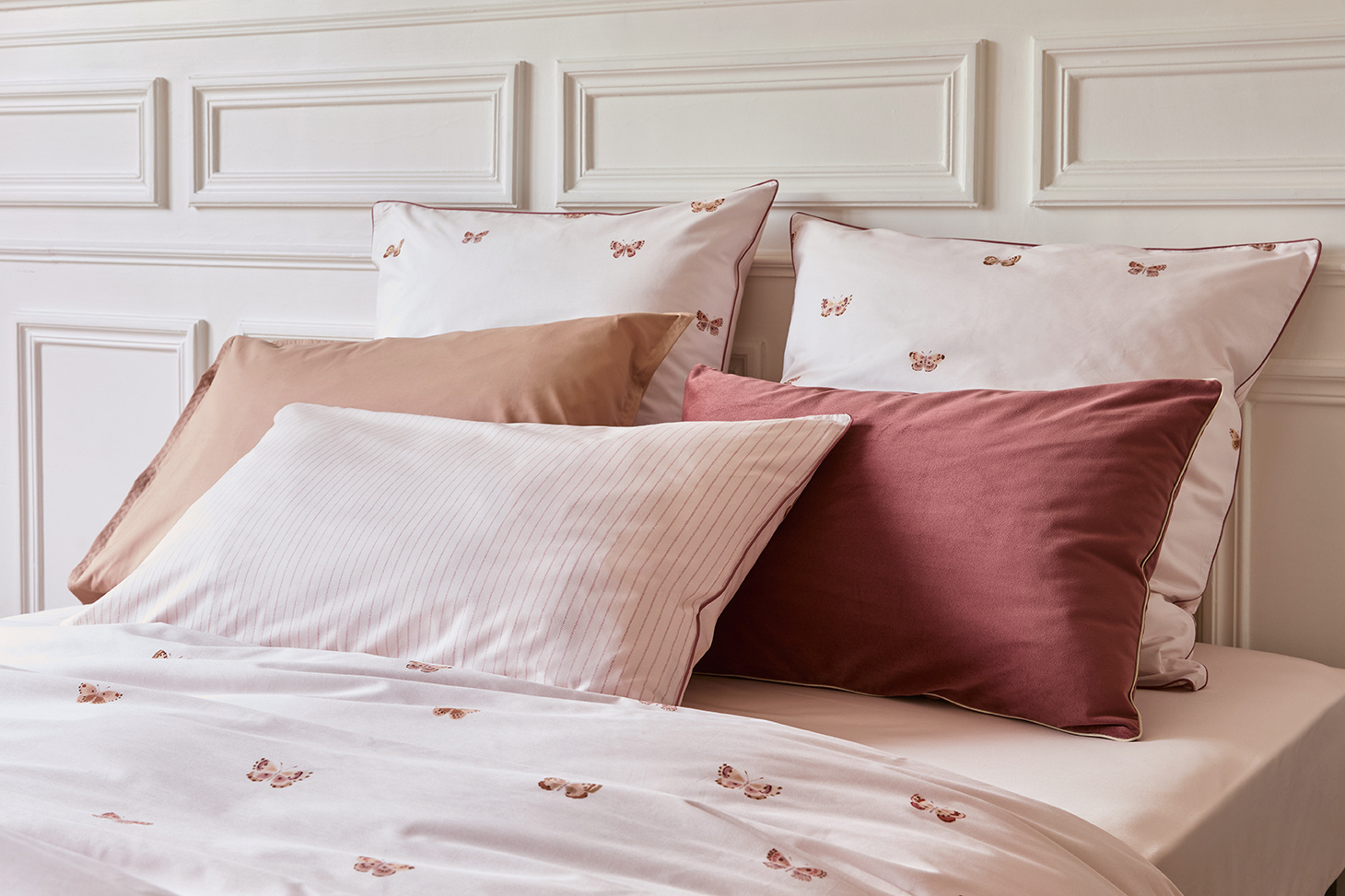 De Délicatesse beddengoedlijn is leuk te combineren met de sierkussen en plaid van Songe in de kleur vanille of de plaid Yogi amande. Gatsby sierkussens in de kleur rose indien en sépia maken ook het geheel af.