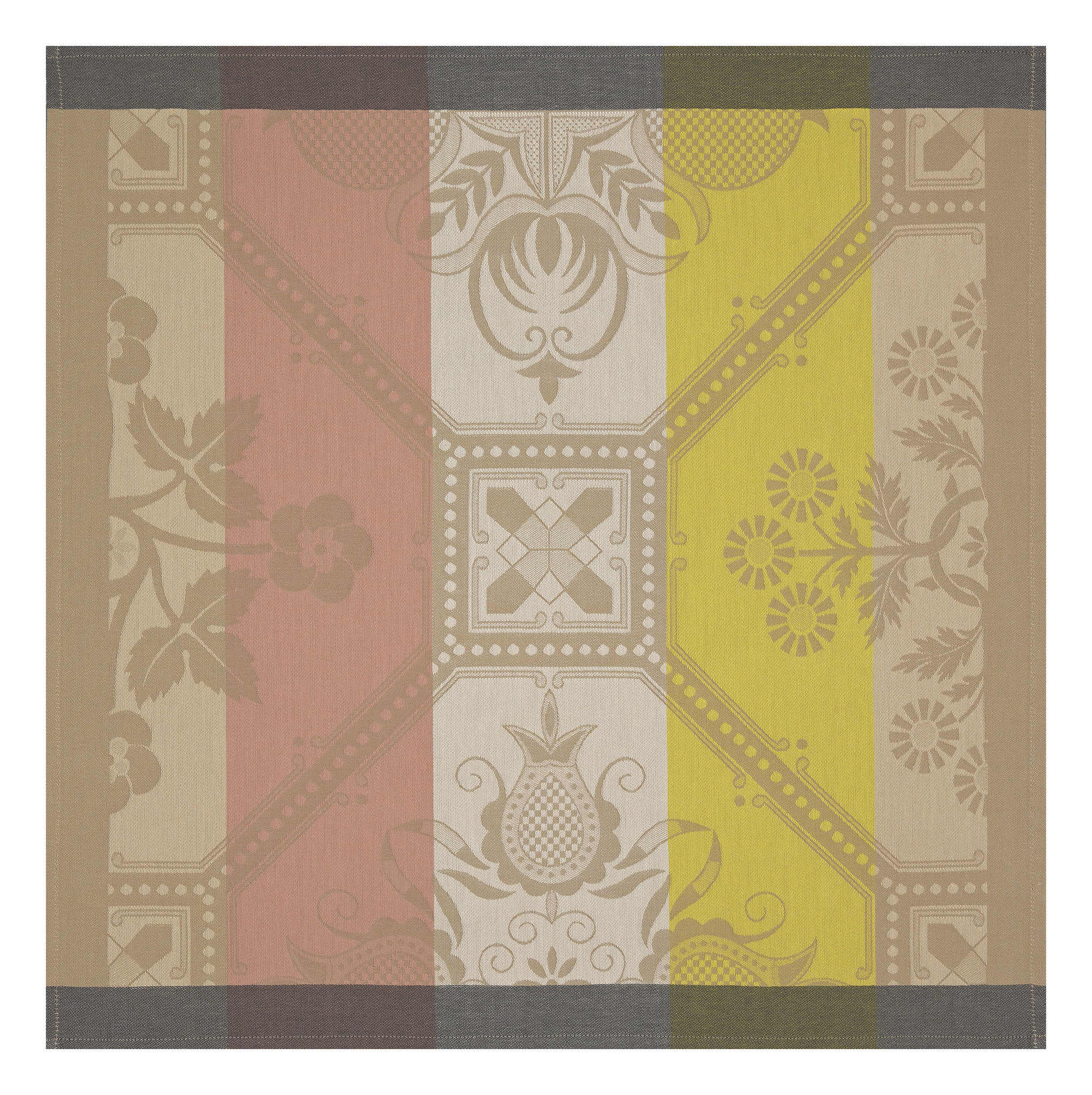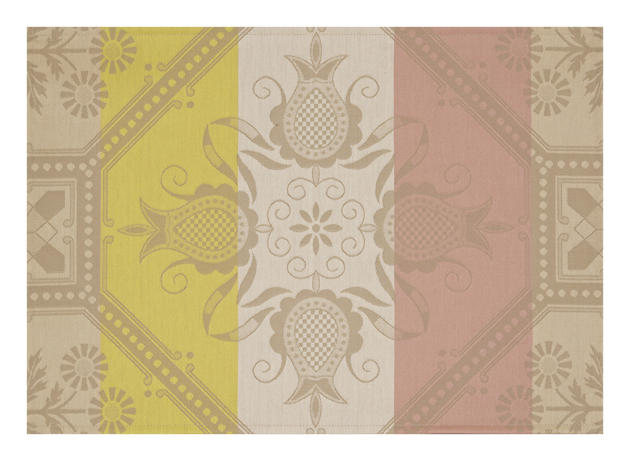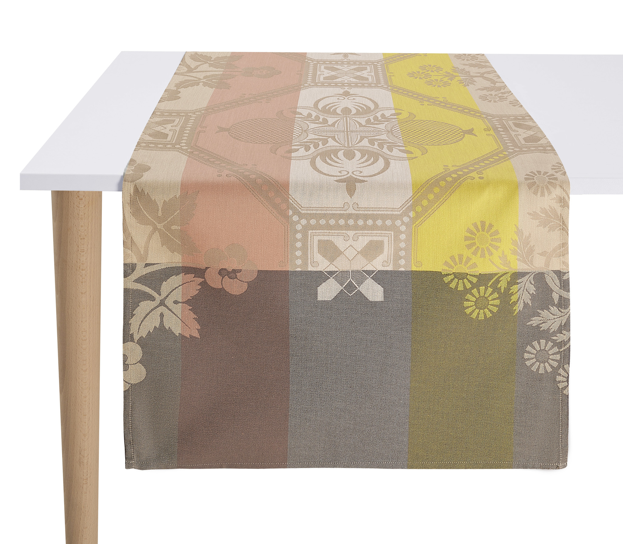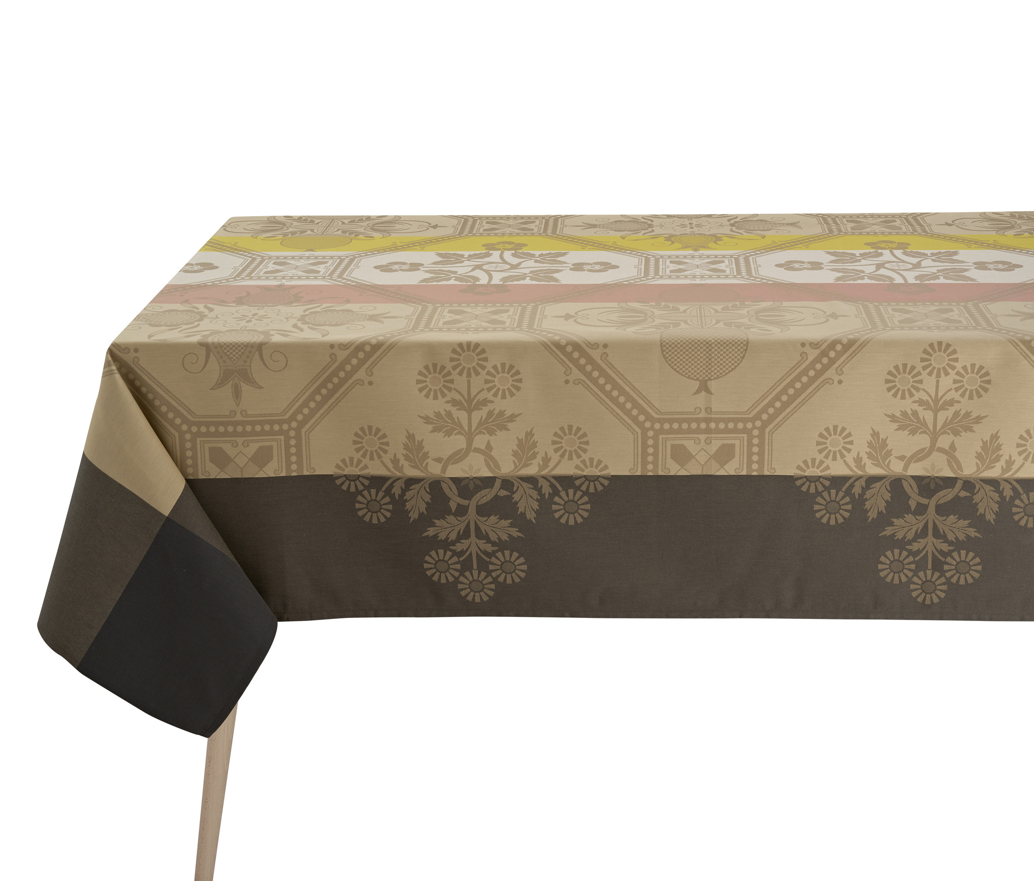 De smeedijzeren ontwerpen, de ornamentiek van de gevels en de geometrie van de Spaanse vloeren zijn in dit bijzonder tafellinnen Hacienda van Le Jacquard Français verbonden met een spel van gedurfde strepen. Een vastberaden zwart, doordrenkt met de Spaanse cultuur, omlijst consequent de moderne bolero-rode, zandsteenbeige en horizongrijze varianten.