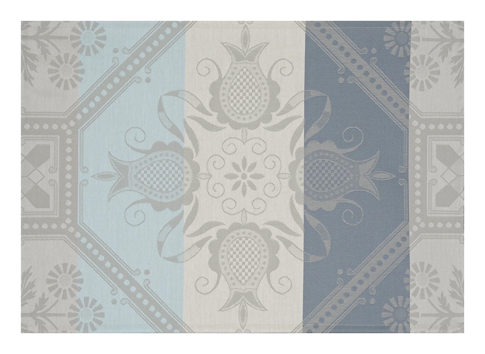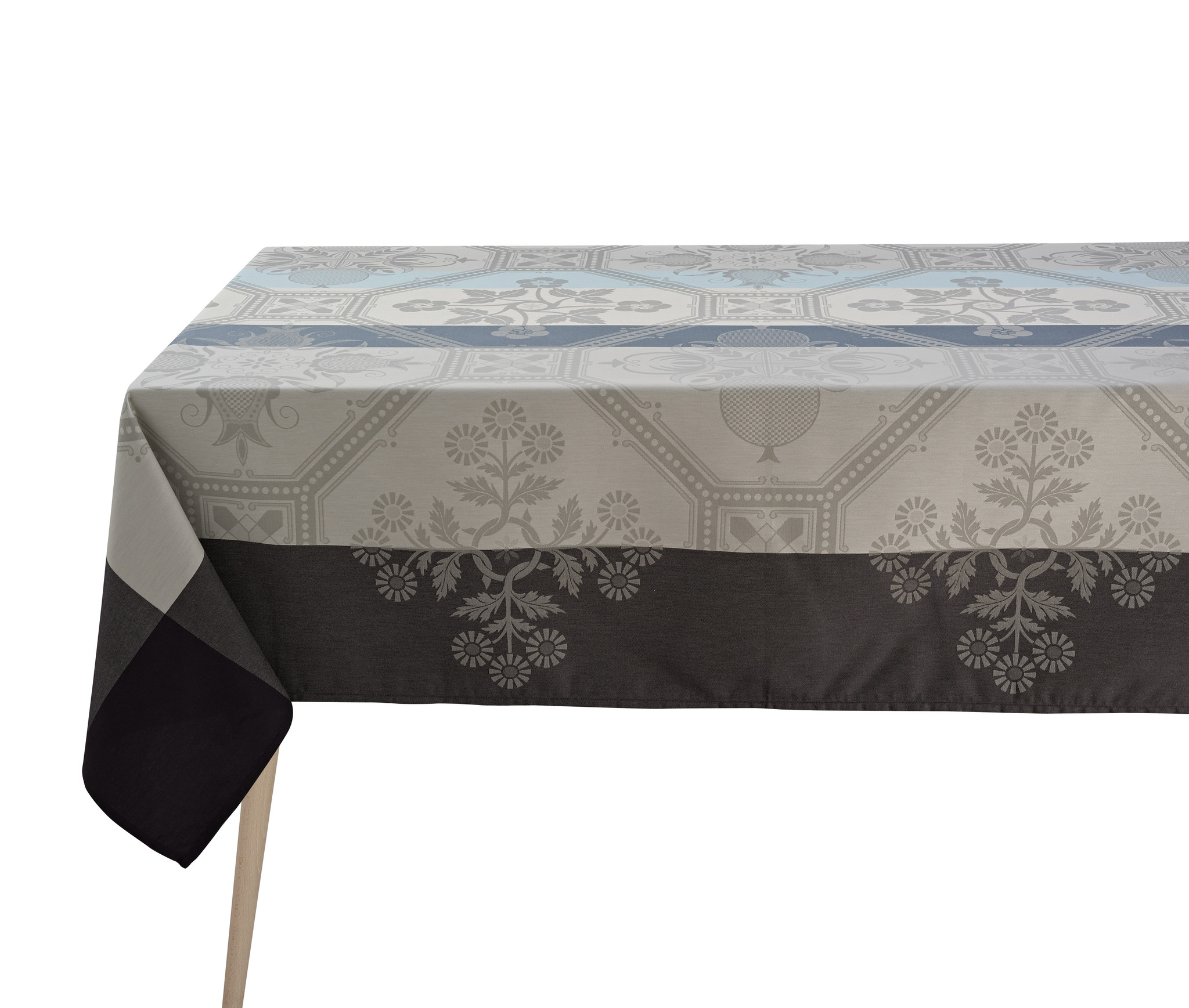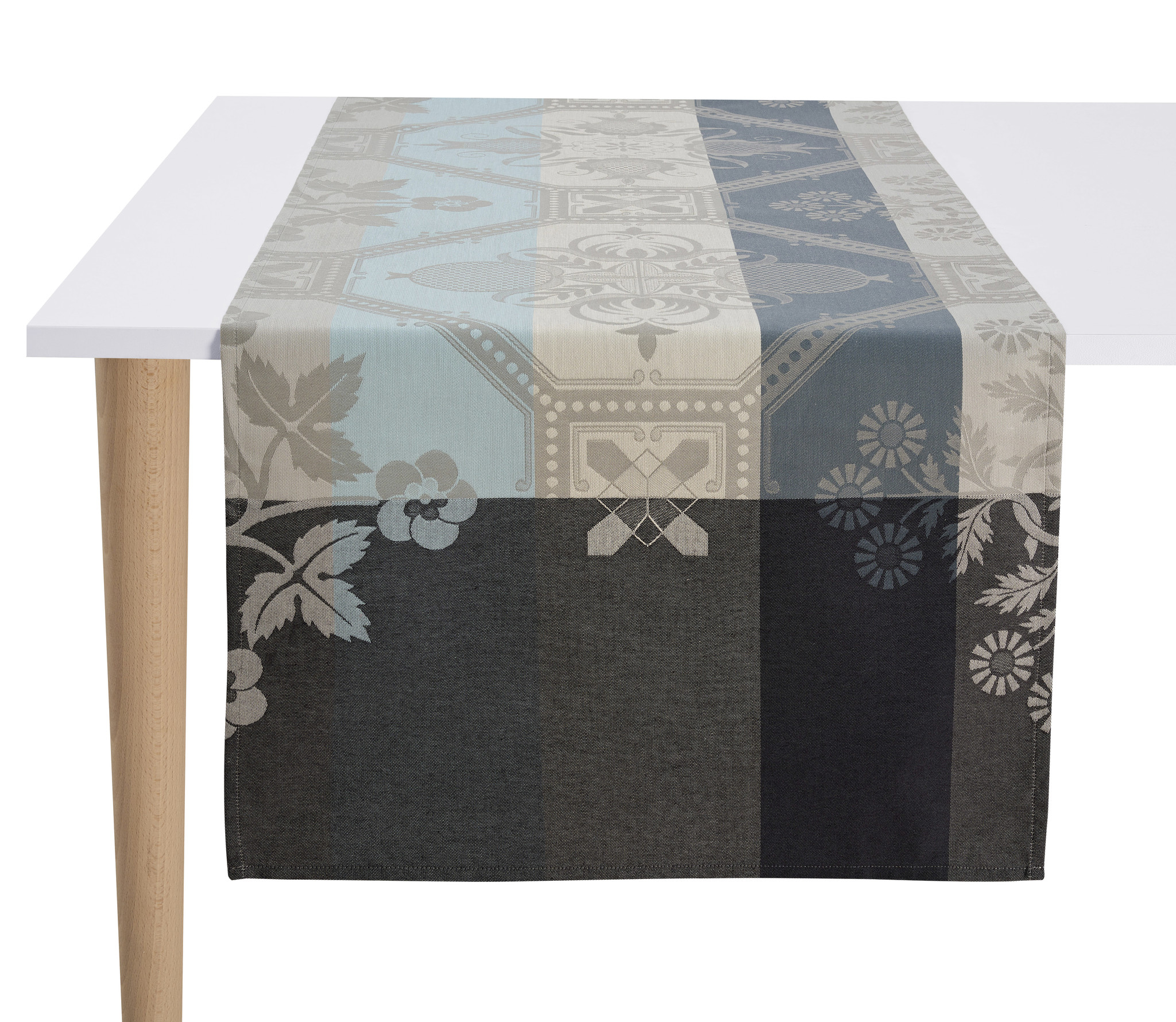 De smeedijzeren ontwerpen, de ornamentiek van de gevels en de geometrie van de Spaanse vloeren zijn in dit bijzonder tafellinnen Hacienda van Le Jacquard Français verbonden met een spel van gedurfde strepen. Een vastberaden zwart, doordrenkt met de Spaanse cultuur, omlijst consequent de moderne bolero-rode, zandsteenbeige en horizongrijze varianten.