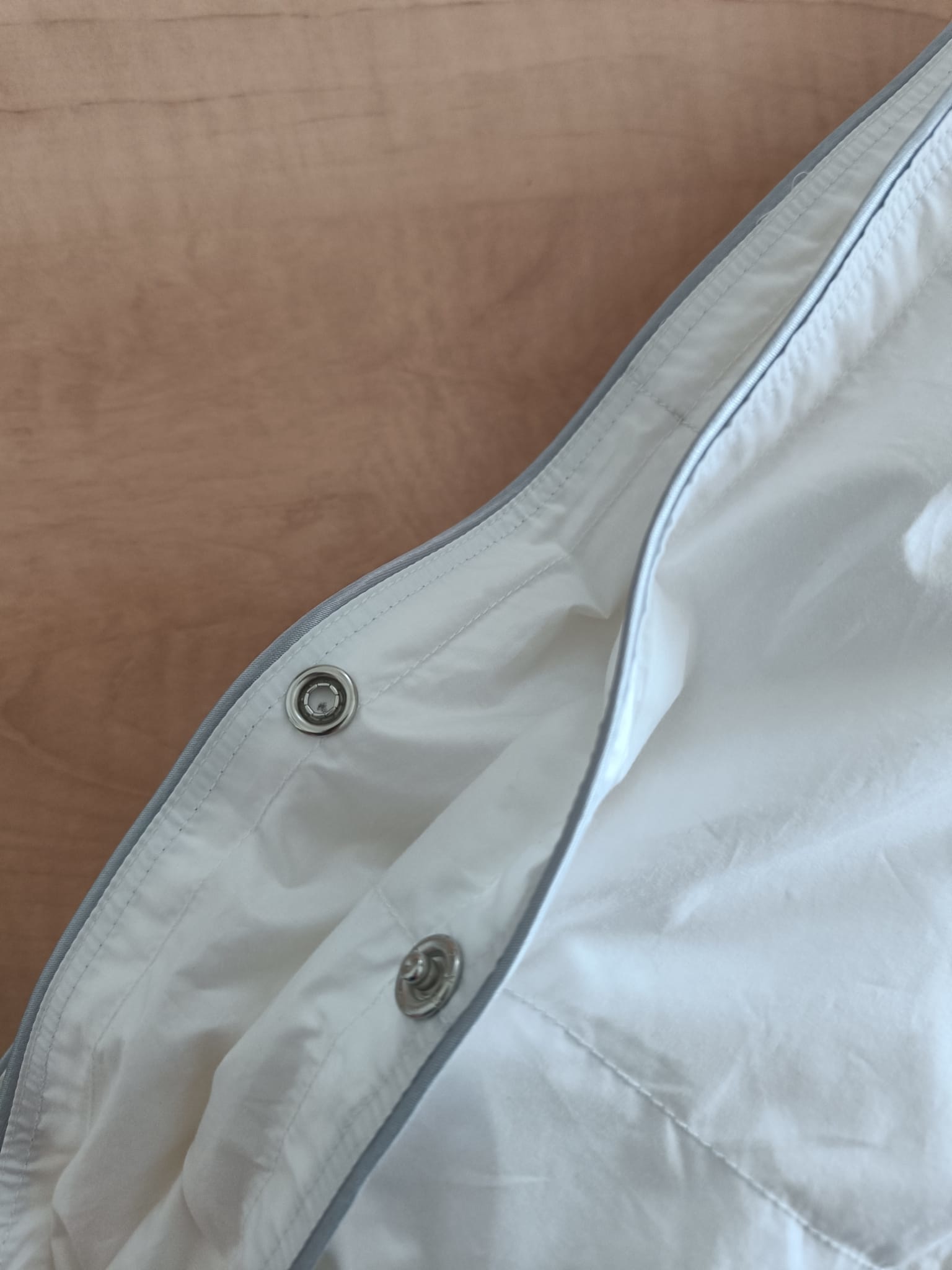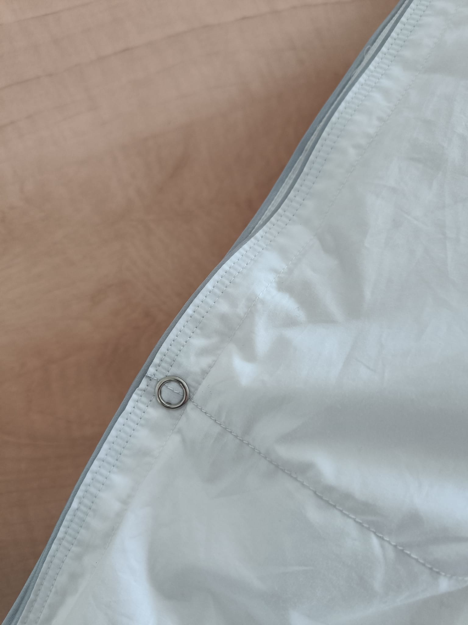 Dit vierseizoenen dekbed bestaat uit een herfstdekbed en een zomerdekbed, welke aan elkaar te bevestigen zijn d.m.v. een goede kwaliteit drukknoopverbinding (zie foto 3 en 4), die in de rand van de dekbedtijk worden gemaakt, zodat u geen kans heeft op donslekkage. Deze twee dekbedden samen vormen een heerlijk warm winter dekbed. De vulling bestaat voor 90% uit zuiver Arctische eendendons en 10% veertjes en heeft een vulkracht van 145 mm. De witte tijk is geweven in 100% gekamde katoen, Nm100.