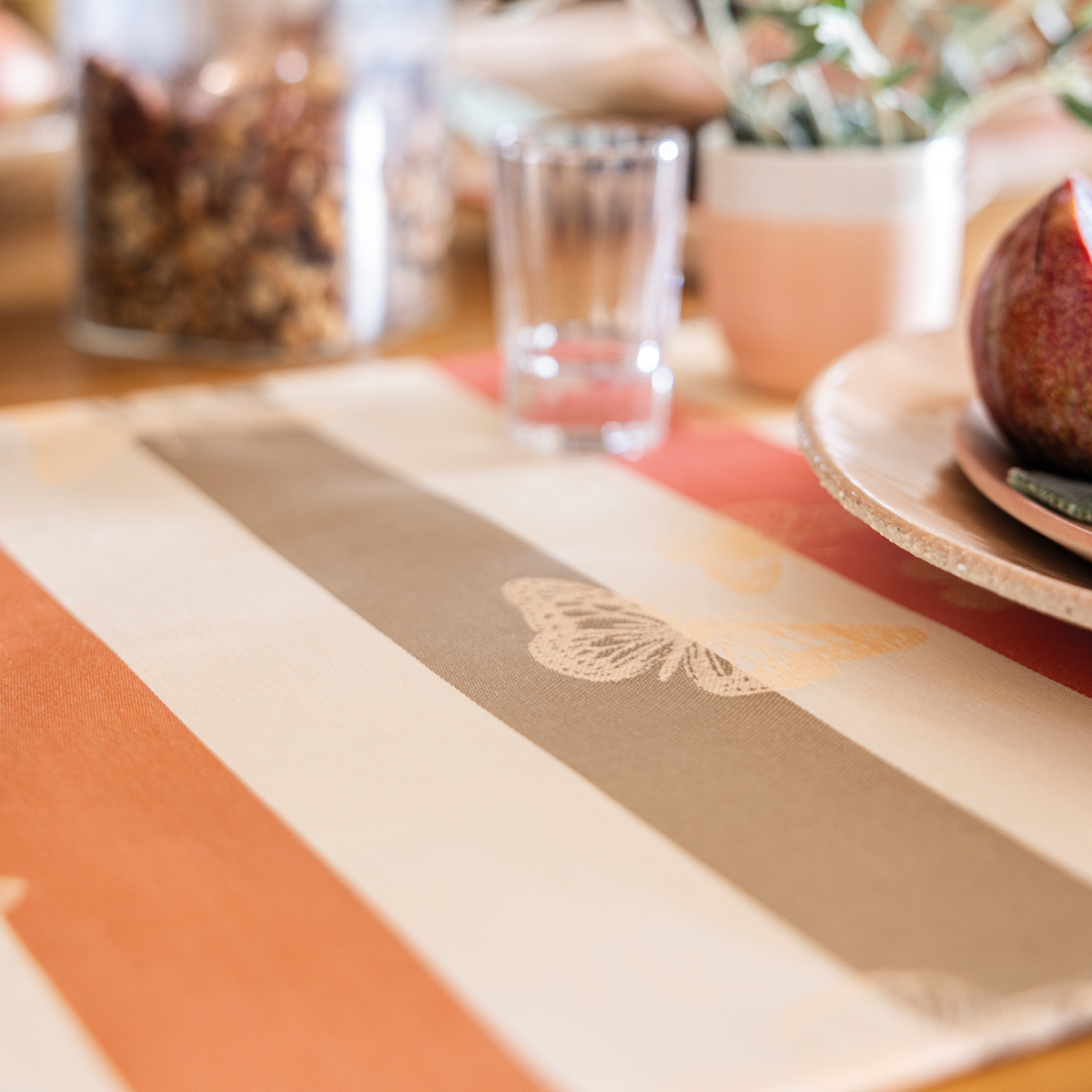 Geef uw tafel een uitgesproken karakter met tafelkleed Bal des Papillons pink van het Franse kwaliteitsmerk Le Jacquard Français. De veelkleurige strepen in warme tinten roepen het gevoel op van een zomerse middag in een rustige, bloemrijke tuin; waar vlinders dansen en stilte spreekt. Een tafelkleed dat durft én ontspant.
