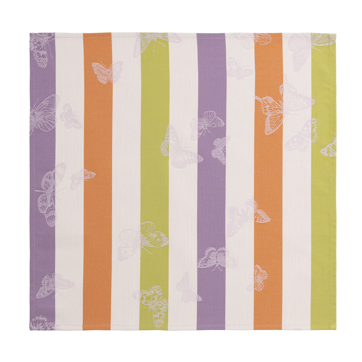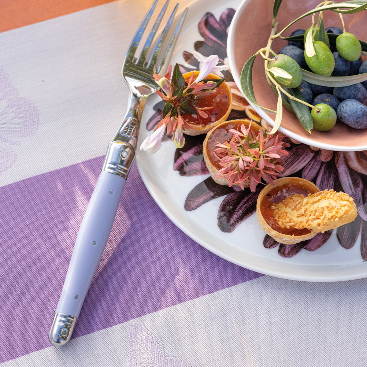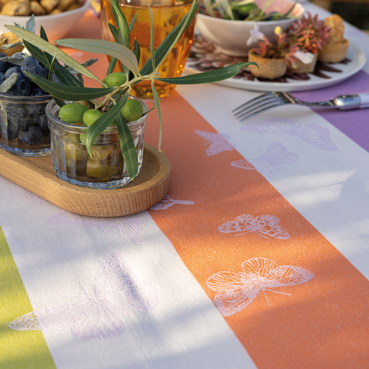 Geef uw tafel een uitgesproken karakter met tafelkleed Bal des Papillons purple van het Franse kwaliteitsmerk Le Jacquard Français. De veelkleurige strepen in warme tinten roepen het gevoel op van een zomerse middag in een rustige, bloemrijke tuin; waar vlinders dansen en stilte spreekt. Een tafelkleed dat durft én ontspant.