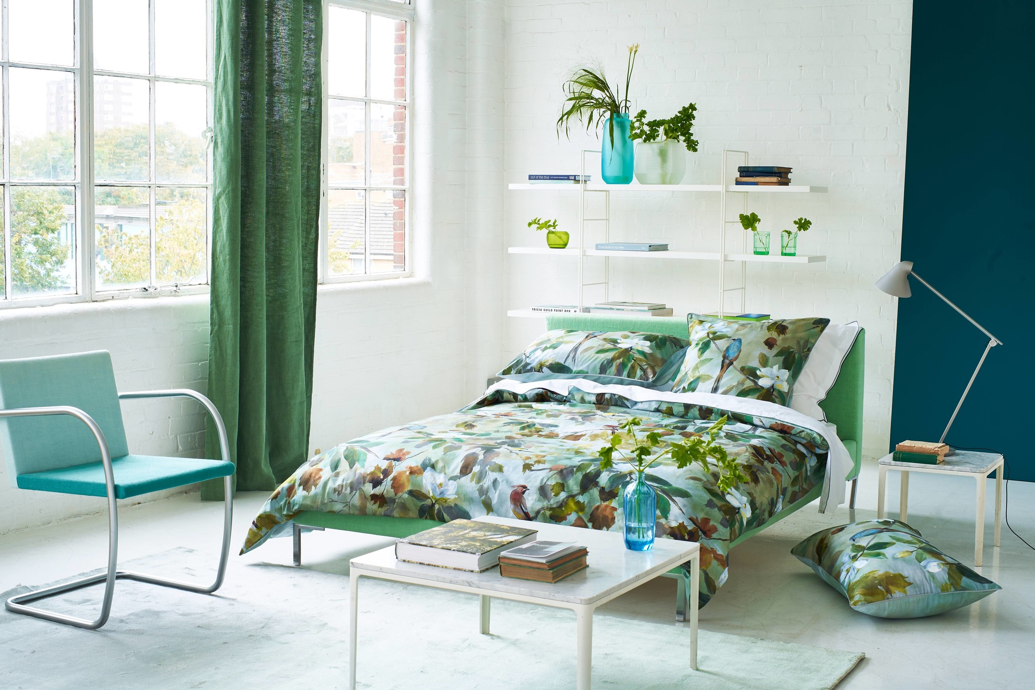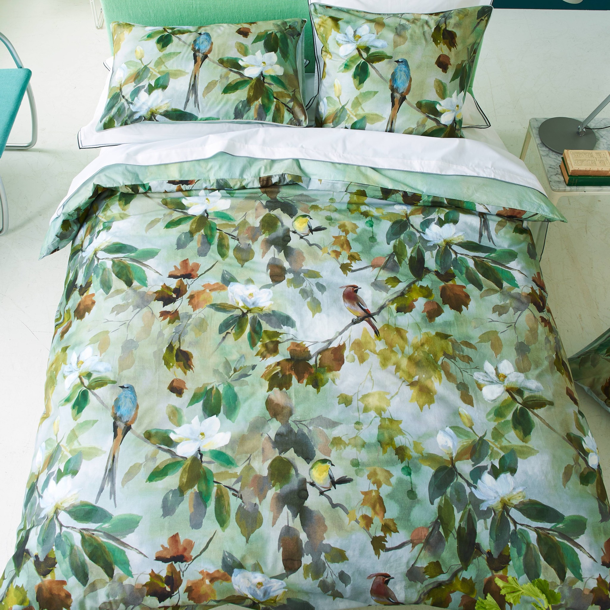 Met waterverf geschilderde bladeren en bloeiende magnolia's creëren dit prachtige Maple tree ontwerp van Designers Guild. De mooie vogels verrijken het dessin met hun prachtige kleuren. Perfect in combinatie met de tijdloze Astor natural en Forest & Sage.