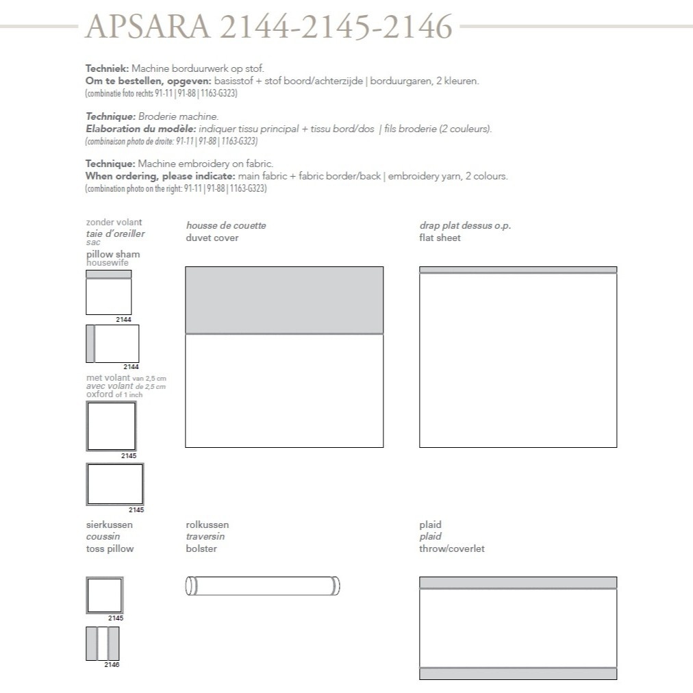 Keuze in kussenslopen en afwerking Bij dit ontwerp kunt u kiezen uit twee verschillende typen kussenslopen: ✔ Model 2144, waarbij wordt gewerkt met een combinatie van twee stofkleuren die door middel van de gekozen sierstiksels vloeiend in elkaar overlopen; ✔ Model 2045, voorzien van een elegant sierstiksel op de smalle volant van 2,5 cm, waarbij het kussen verder volledig glad blijft.