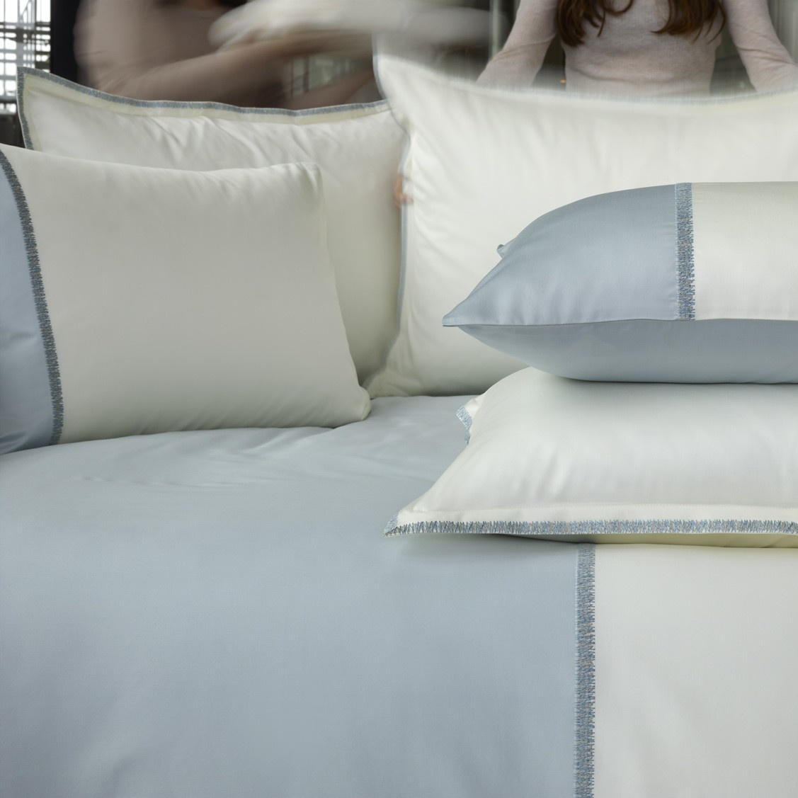 Persoonlijk, verfijnd en anders dan anders is de Apsara beddengoedlijn van Mirabel Slabbinck. Dit ontwerp onderscheidt zich door twee karakteristieke, licht “krassende” sierstiksels die subtiel in elkaar overlopen. Hier komt het vakvrouwschap van Mirabel Slabbinck en haar team duidelijk naar voren. Elk detail wordt met uiterste precisie uitgevoerd in het Belgische atelier.