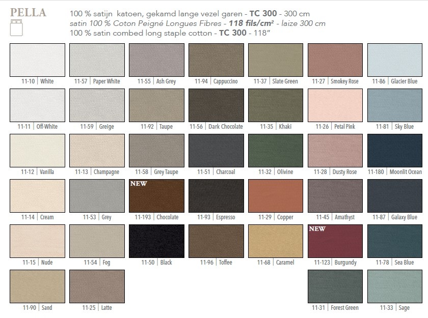 Kenmerken ✔ Pella 300TC langstapelig gekamd katoen satijn; ✔ Subtiele glans en zijdezachte touch; ✔ Twee karakteristieke sierstiksels; ✔ Voor de kussenslopen keuze uit model 2144 of model 2145; ✔ Mogelijkheid tot sierkussenslopen met drie kleurvakken; ✔ Vrije keuze in stof- en borduurkleuren; ✔ Belgisch vakmanschap; ✔ Volledig maatwerk.