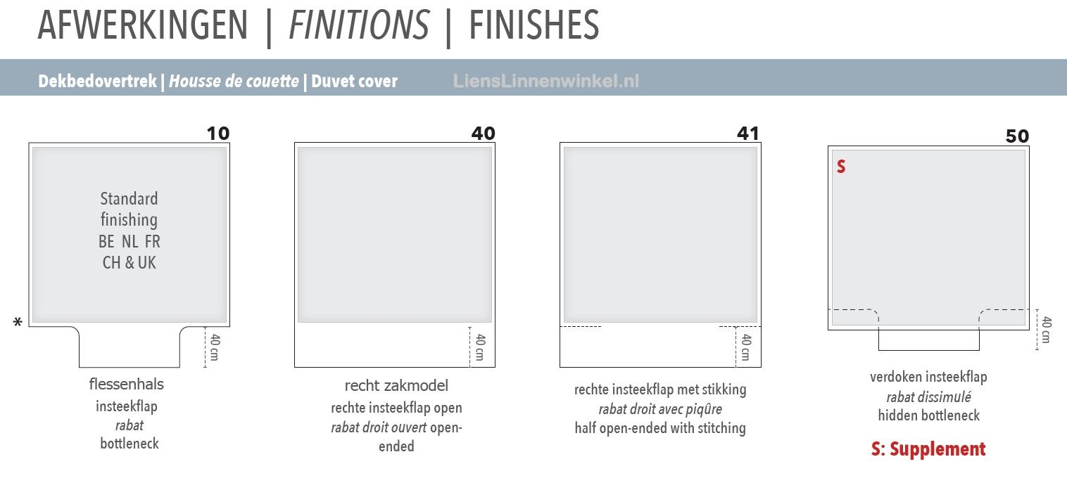 De dekbedovertrekken worden standaard afgewerkt met een flessenhals. De prijzen zoals deze genoemd zijn, zijn losse prijzen voor een dekbedovertrek zonder sloop / slopen. Wilt u graag een dekbedovertrekset bestellen, dan dient u én een dekbedovertrek te bestellen én 1, 2 of meerdere slopen, afhankelijk van het aantal slopen dat u zelf wenst.