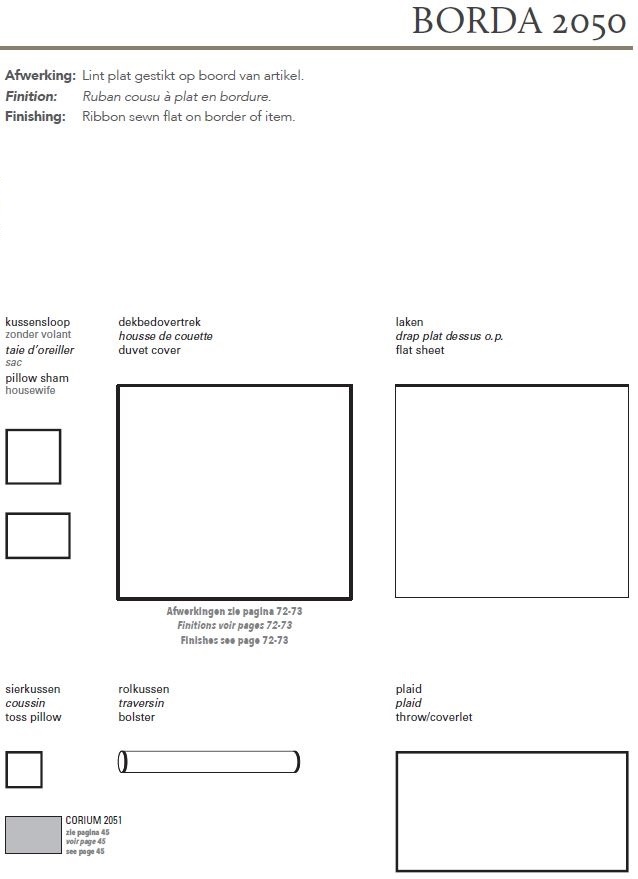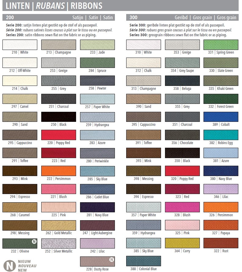 Een strak en sjiek dessin van Mirabel Slabbinck, is toch wel de Borda. Bij de Borda wordt gebruik gemaakt van visgraat lint (te kiezen uit 5 kleuren) die plat gestikt wordt op de boord van de stof.