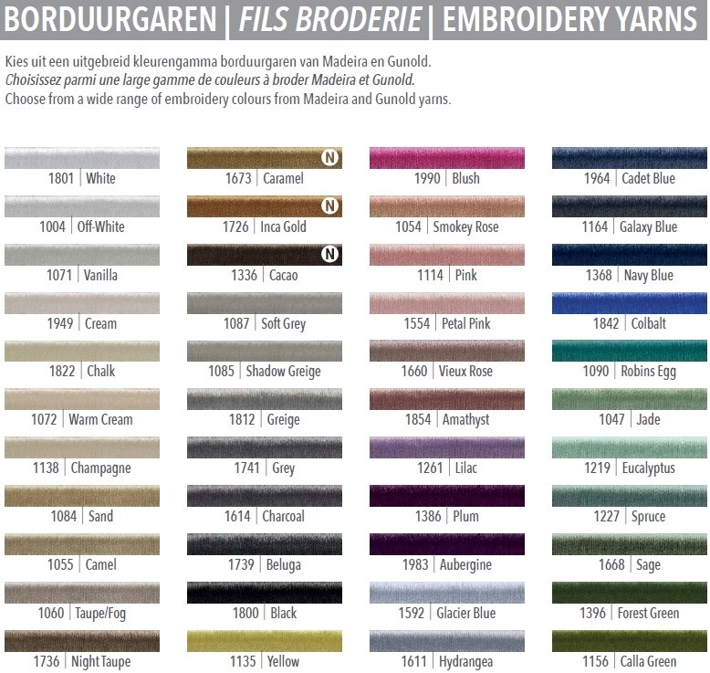 U kiest zelf welke kleur stof en welke kleur borduurgaren. U kunt de kleuren stof en de kleuren van het borduurgaren vinden op de laatste 3 afbeeldingen. Op de foto's is gewerkt met het borduurgaren in de kleur 1248 spring green.