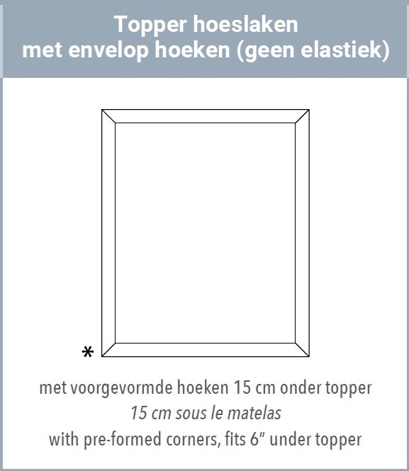 Deze hoeslakens zijn gemaakt met een envelop sluiting in de hoeken, dus geen elastiek. Dit is met name voor slappe toppers een perfecte afwerking. Hierdoor komen namelijk de hoeken niet onder grote druk te staan, waardoor de hoeken van de topper netjes plat blijven liggen als het hoeslaken eromheen zit. Mocht u geen slappe topper hebben, dan adviseren wij u voor een topper te kiezen die voorzien is van elastiek in de hoeken. Bij een stugge topper is het namelijk prettiger een bed opmaken met een topperhoeslaken die voorzien is van elastiek. Dit rekt namelijk mee. Deze vindt u wanneer u iets verder naar beneden scrolt bij "Vaak samen gekocht". Hier vindt u ook hoeslakens voor topmatrassen met een split.