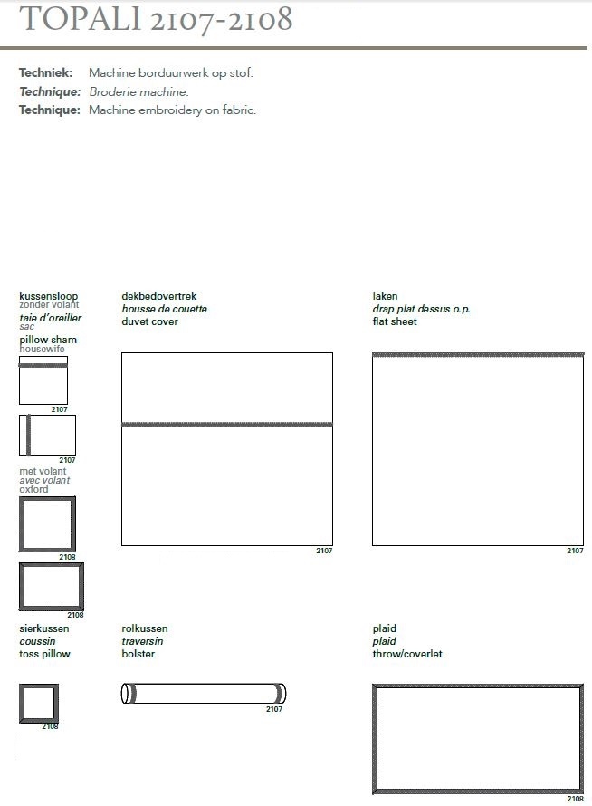U stelt de Topali zelf samen door de kleur stof te kiezen en de kleur van het borduurwerk. De uitgebreide technische tekening op afbeelding 8 laat zien hoe Mirabel Slabbinck het ontwerp bedoelt heeft. Voor het borduurwerk kunt u kiezen uit 1 kleur. De kleuren stof staan afgebeeld op afbeelding 5 en 6 en de kleur van het borduurwerk op afbeelding 7. Op de afgebeelde foto's is kleur 11-11 de stof waar het dekbedovertrek en de voorste kussenslopen van zijn gemaakt met borduurgaren 1055. De achterste 2 kussenslopen zijn gemaakt in de kleur 11-11 met borduurgaren 1822.