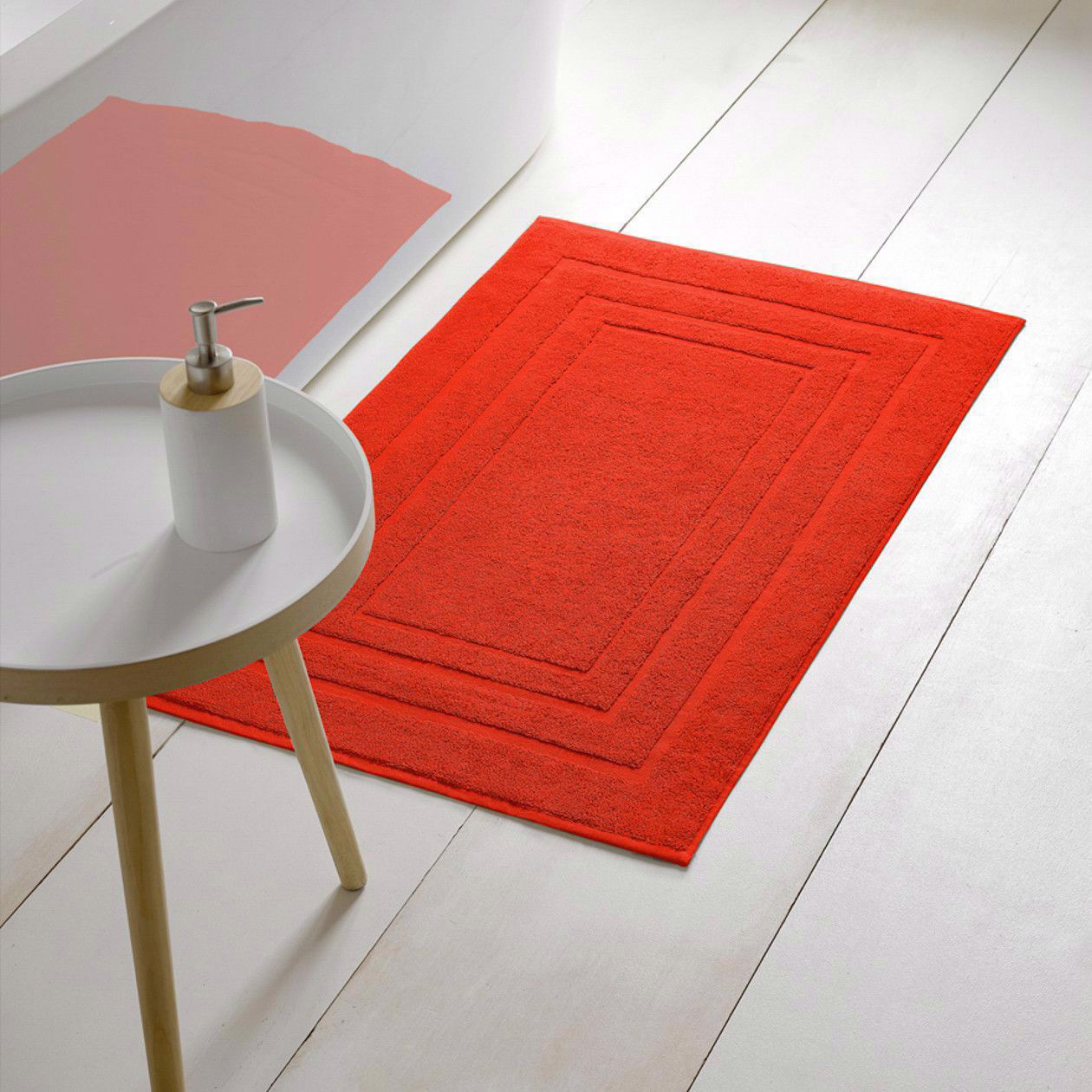 De Pacifique badmat uit de collectie van De Witte Lietaer, in de kleur tiger (een burnt orange tint, geen rood, zoals chili pepper) heeft een gewicht van 1000 gram per m² en is gemaakt van 100% katoen.