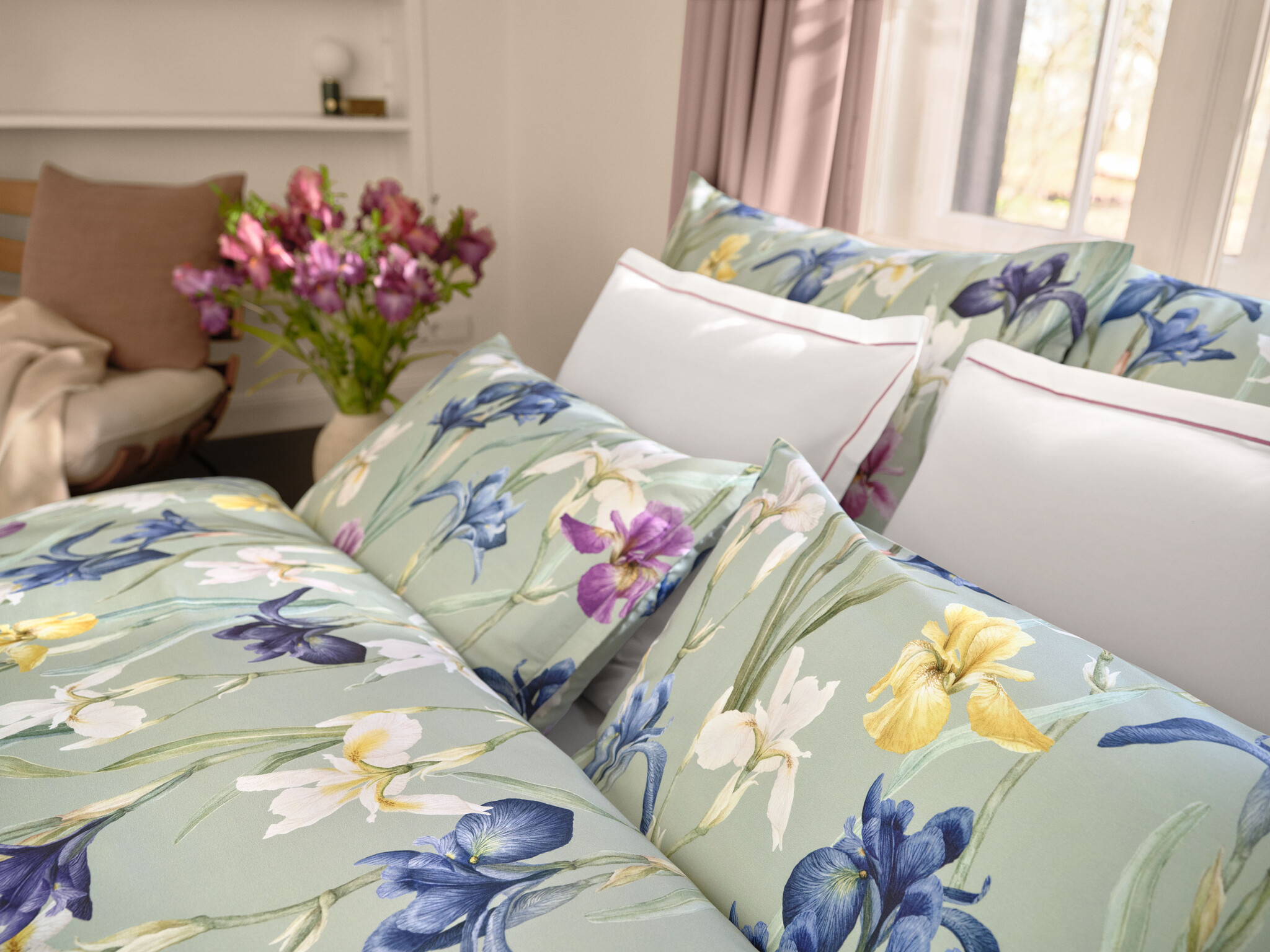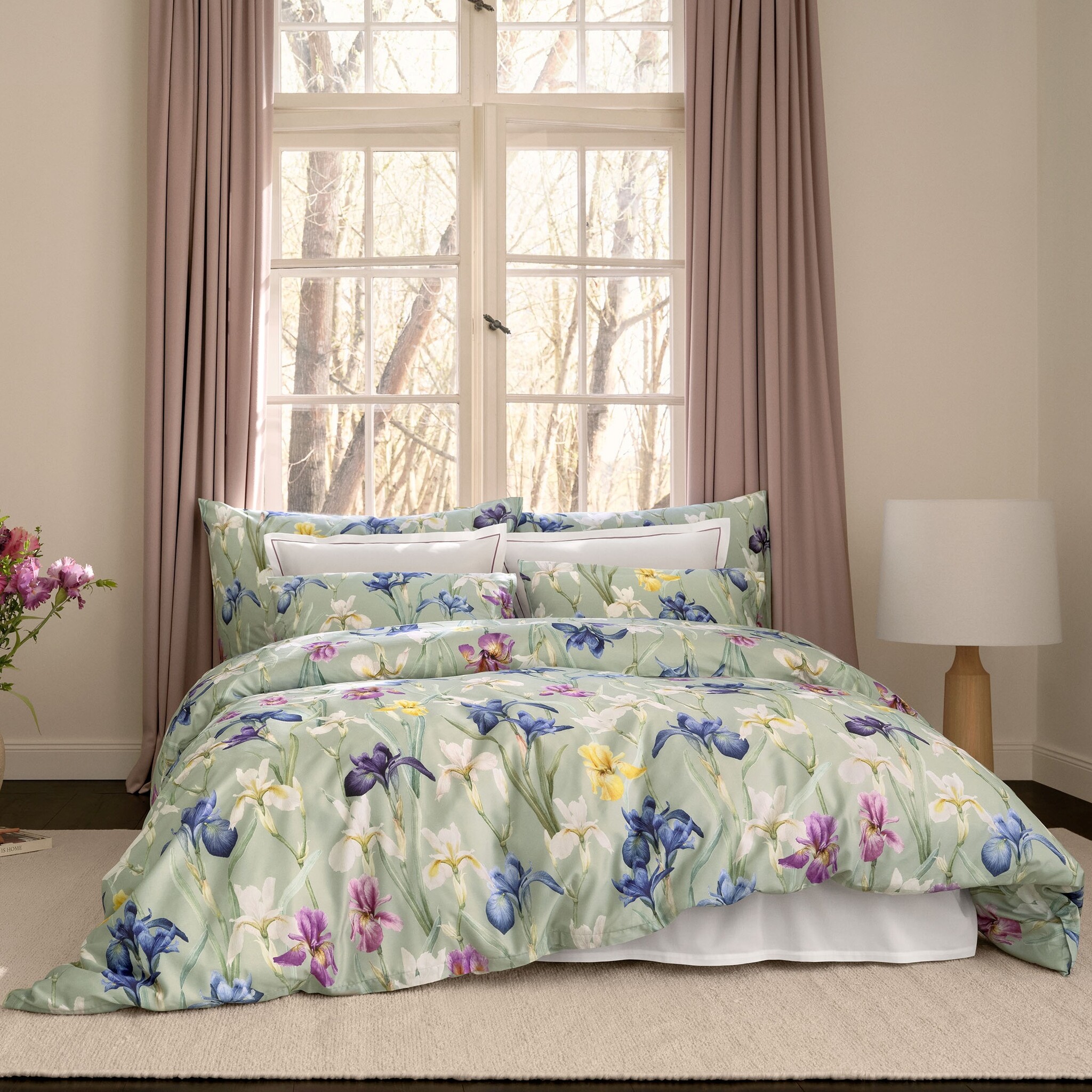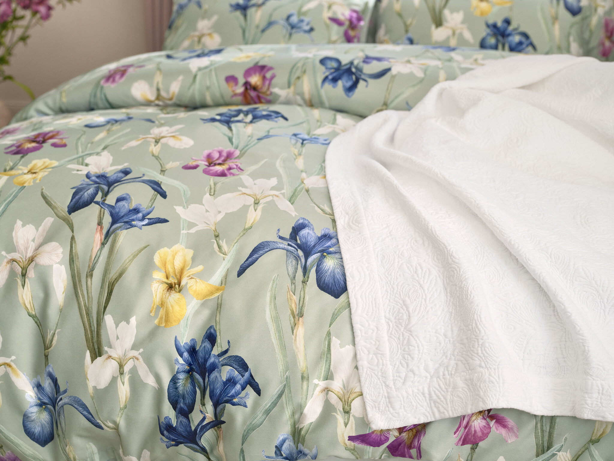 De Charlotte van Schlossberg nodigt je uit om te dwalen door een bijna eindeloze weide van bloeiende irissen in je eigen droomwereld. De bloemhoofdjes op het satijnen beddengoed buigen vol bewondering en toewijding naar elkaar toe en van elkaar af, terwijl het groen op de achtergrond zich nestelt tegen de saliegroene achtergrond. De donkere en soms levendig gekleurde aquarelbloemen in fluweelzacht middernachtblauw tot violet, goudgeel en ivoor nemen het middelpunt in en trekken je aandacht.