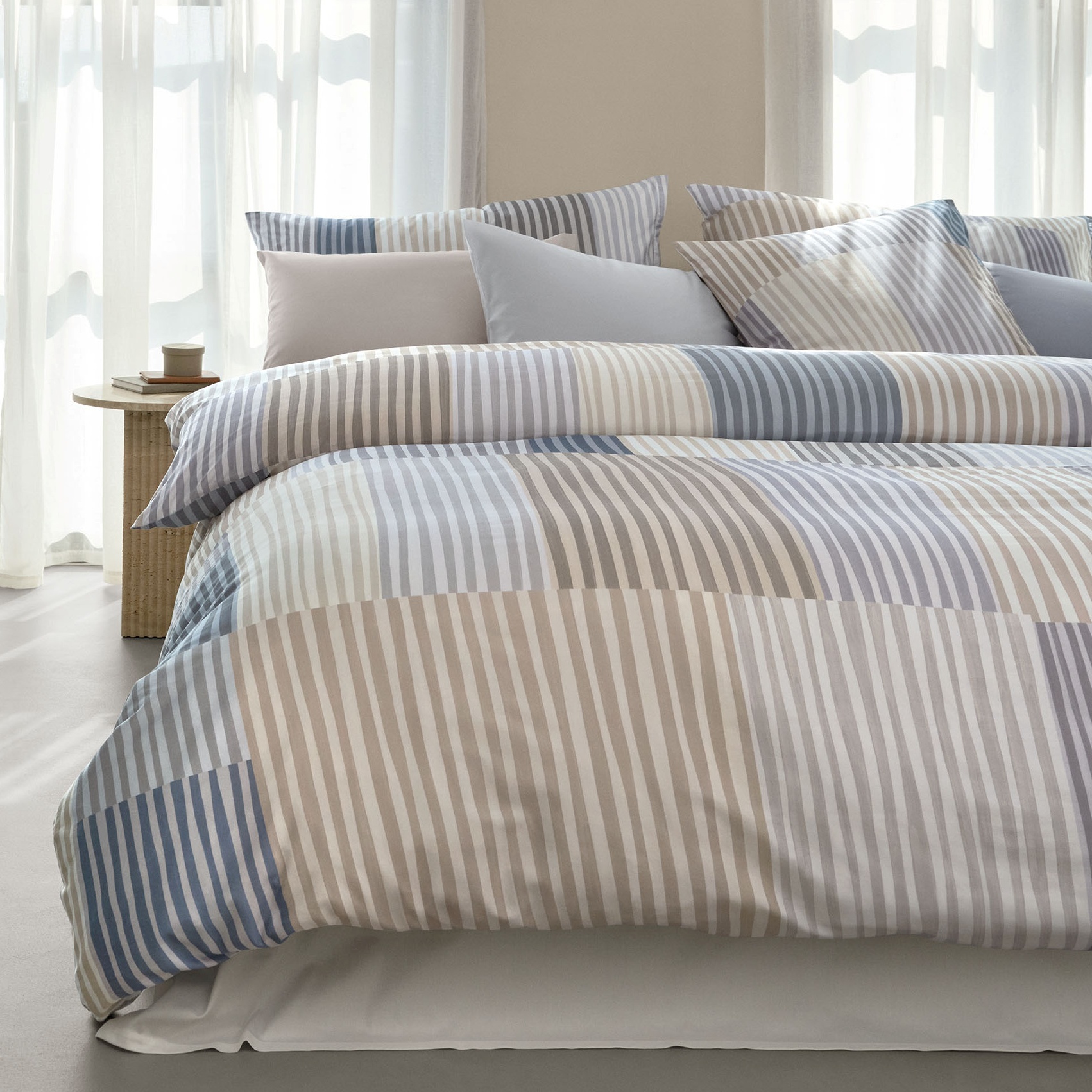 Het Melvin bedlinnen geeft een eigentijdse draai aan de klassieke streep. Met de hand geschilderd in gouache en aangebracht met een brede kwast, ontstaan royale kleurvlakken die in een speels ritme naast elkaar bewegen. De levendige compositie combineert contrasterende lichte en donkere tinten, afgewisseld met zachte beige nuances en een helder, kleurrijk palet. Het resultaat is een grafisch ontwerp dat uitnodigt tot eigen interpretatie en elke slaapkamer een frisse, moderne uitstraling geeft.