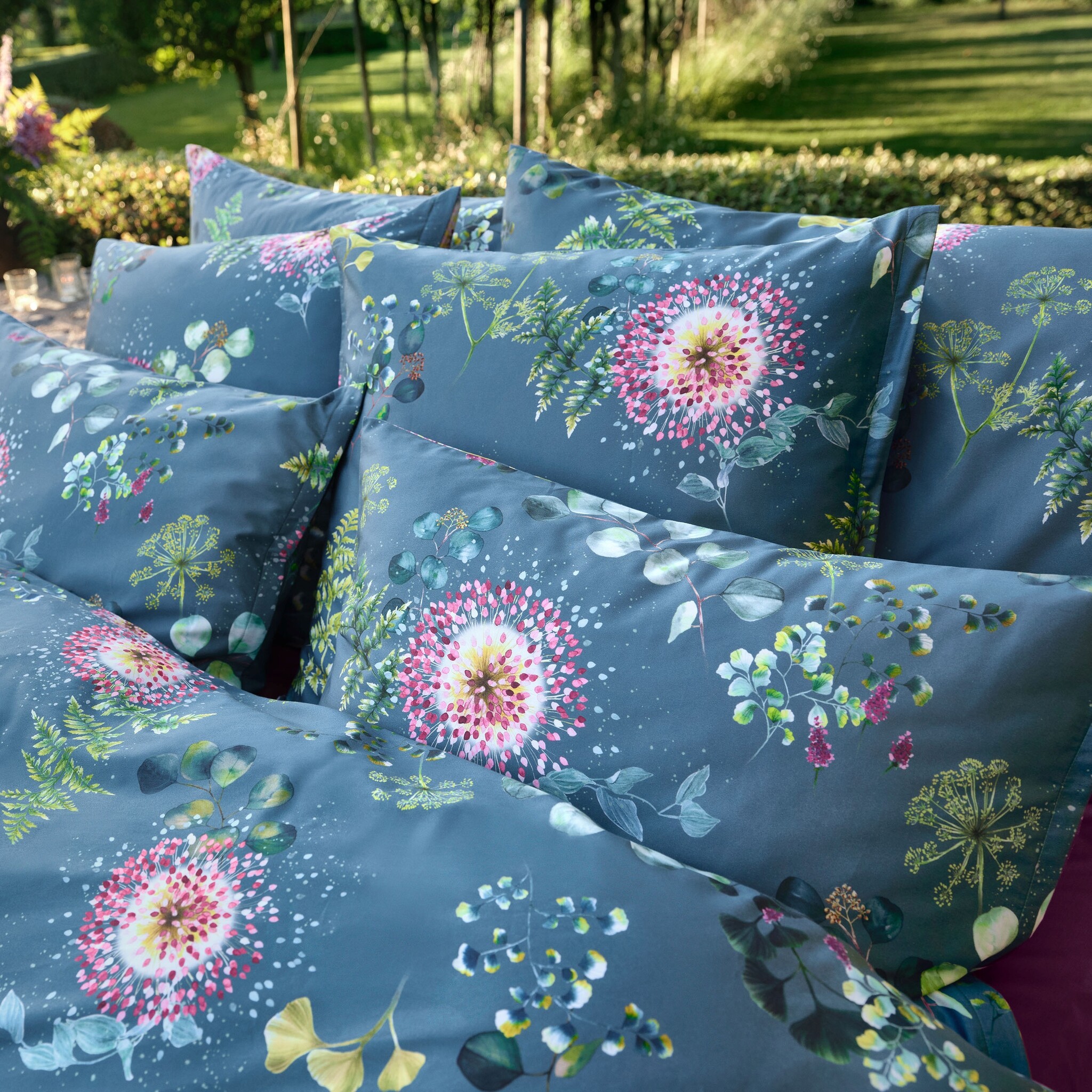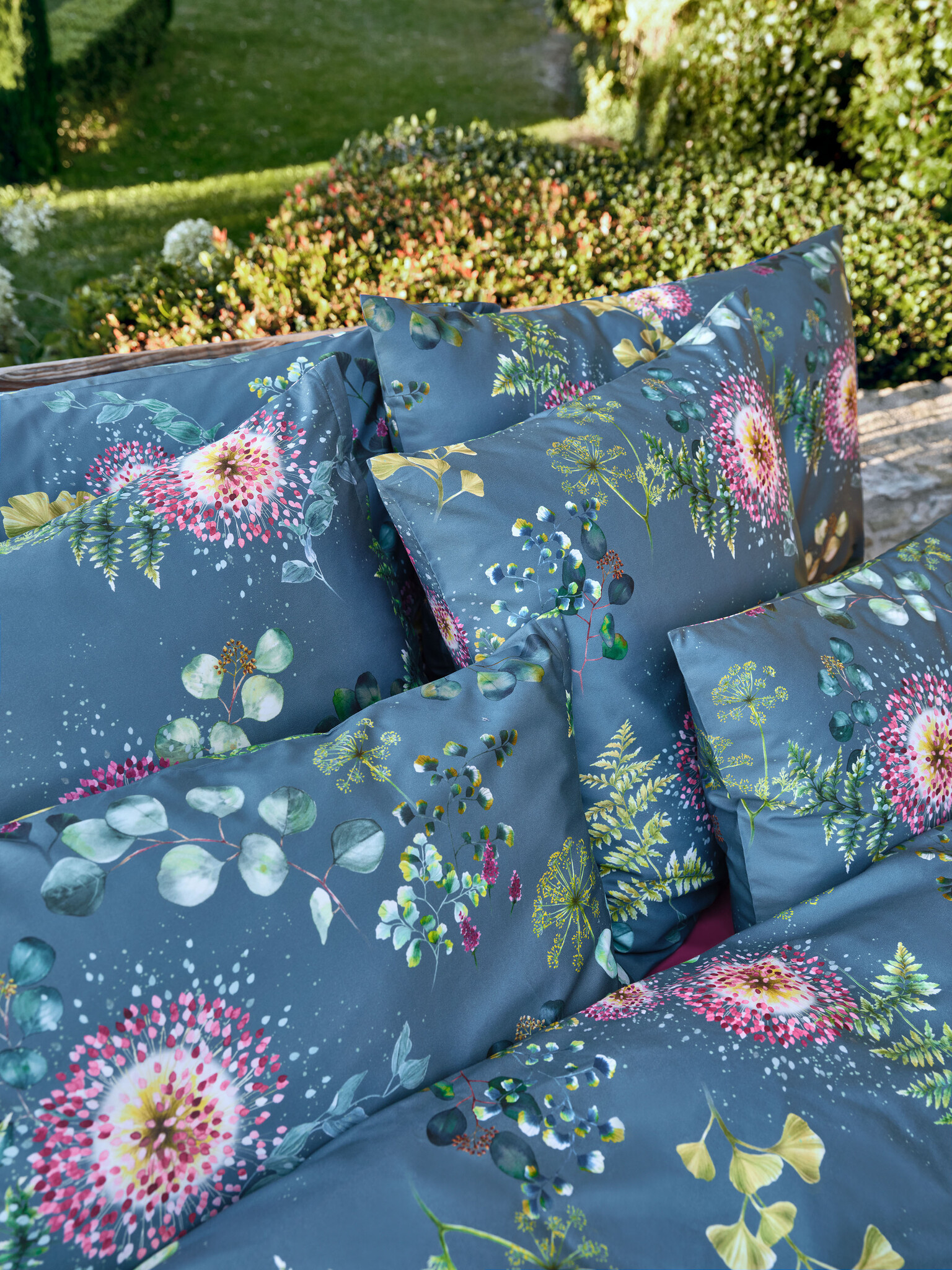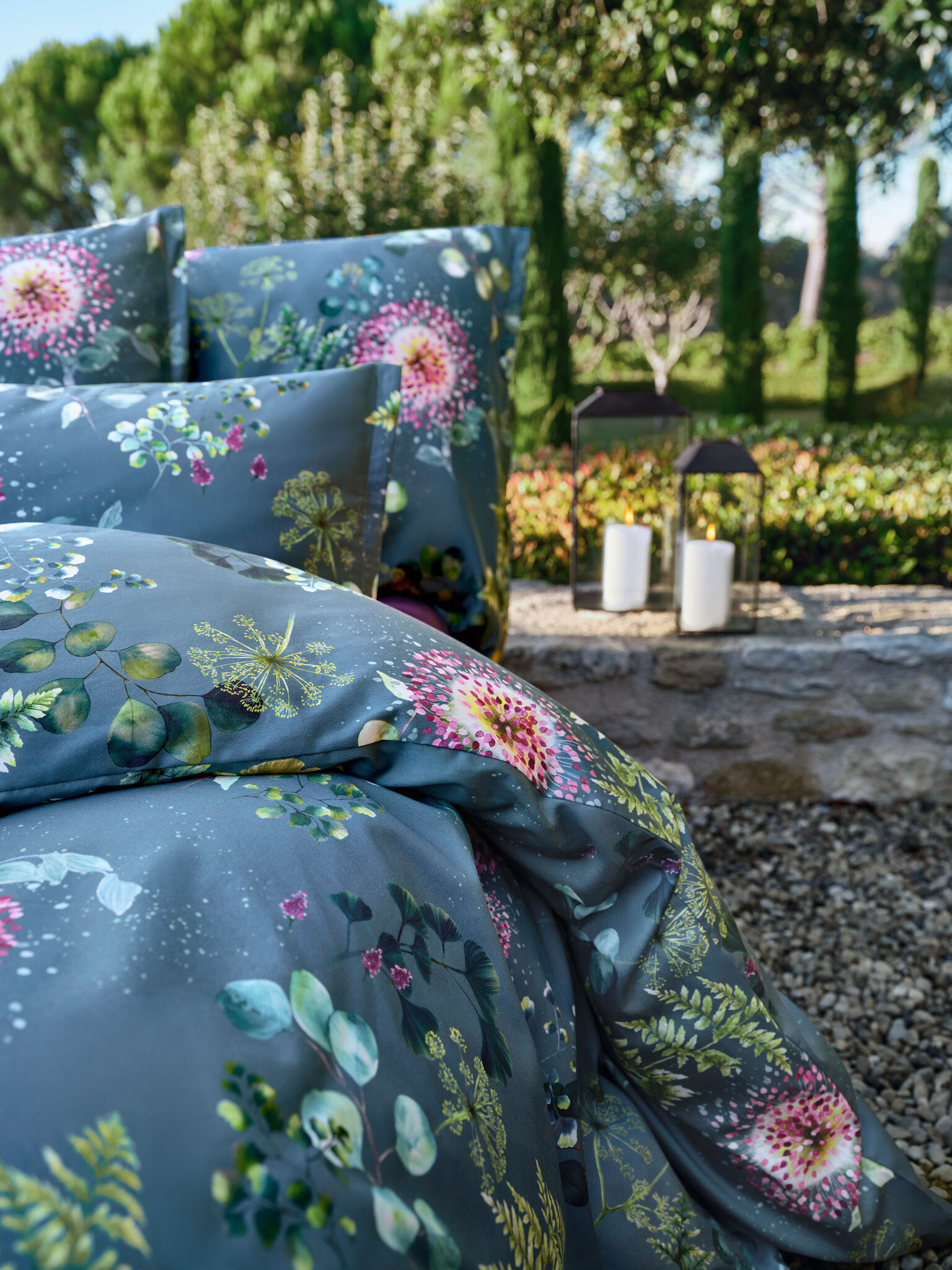 Wat een magisch gevoel is het om 's avonds door deze prachtig bloeiende tuin te dwalen. De bloemschermen met wilde venkel schitteren als klein vuurwerk op de petrolblauwe achtergrond van het dekbedovertrek Nele van Schlossberg, aangevuld met een rijkelijk gevarieerd bladerdek in alle tinten groen, van limoengroen tot olijfgroen, jadegroen en aquamarijngroen tot mosgroen en dennengroen. Dankzij het maanlicht kun je 's nachts zelfs eucalyptus, ginkgo, venushaar en varens in het donker spotten.