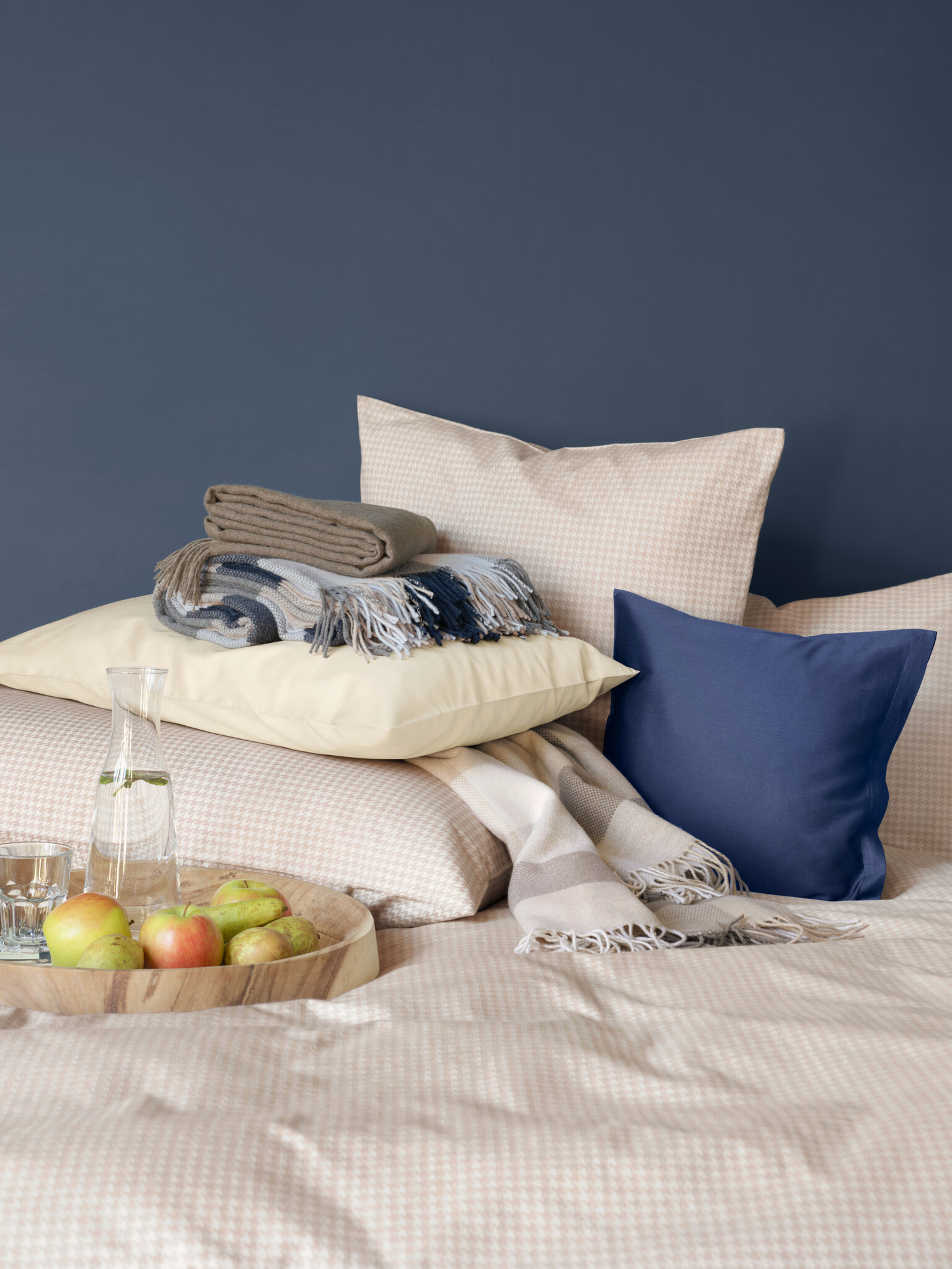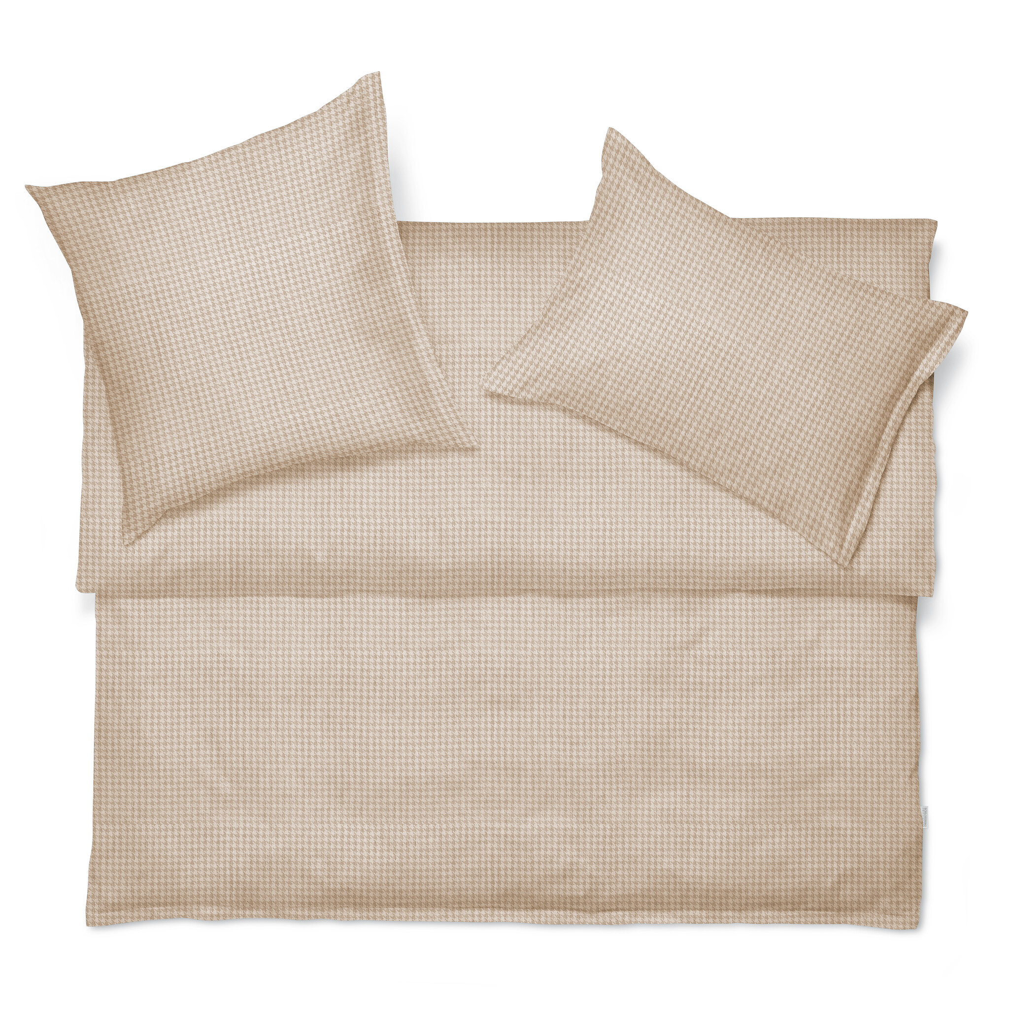 Het ontwerp Theo van Schlossberg breidt de Casual Luxury collectie uit met een nieuw bedlinnendessin in zacht flanel van puur katoen. Het grafische Pied-de-Poule patroon in warm beige ontleent zijn zachtheid aan de zachte opruwen van het oppervlak en is een tijdloze klassieker. Het resultaat is een fijn geweven jacquardpatroon van kwaliteitsflanel, dat warm, ademend, onderhoudsvriendelijk en strijkvrij is. Dit ontwerp is gemaakt in flanel (100% katoen) 190TC.