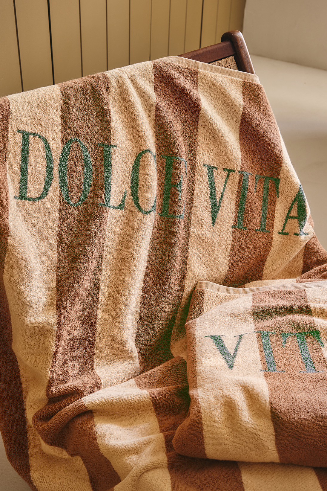 Het Dolce Vita-dessin straalt een zomerse, Italiaanse flair uit met subtiele kleuren en verfijnde details. Dankzij het royale formaat van 100x180cm biedt het strandlaken genoeg ruimte om comfortabel te liggen of te loungen. Leuk te combineren met strandlaken Amour.
