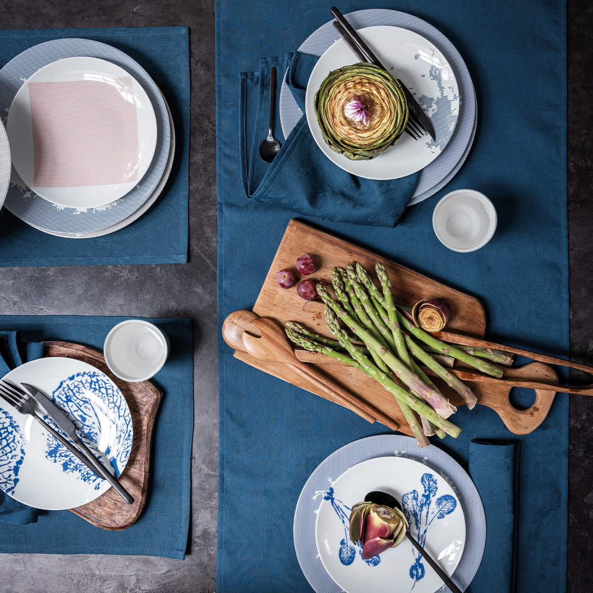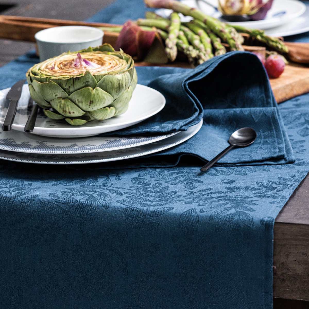 Le Jacquard Français gecoat tafellinnen Vegetal Mood blue; stijlvol, praktisch en natuurlijk in 100% katoen