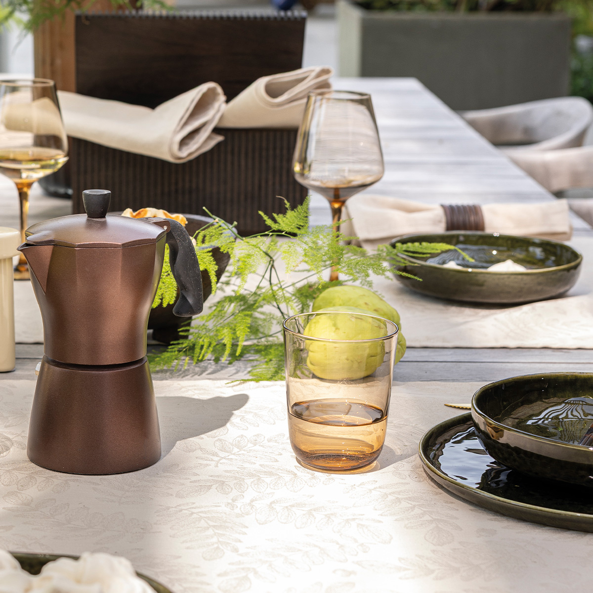 Het tafellaken is gemaakt van 100% katoen met een hoogwaardige acrylaatcoating, waardoor het vlekafstotend en makkelijk afneembaar is met een vochtige doek. De coating beschermt het textiel zonder het natuurlijke gevoel van katoen te verliezen: de stof blijft soepel, zacht en behoudt zijn elegante glans, Ideaal voor dagelijks gebruik, binnen of buiten.